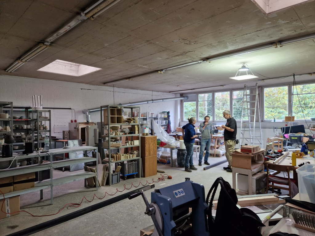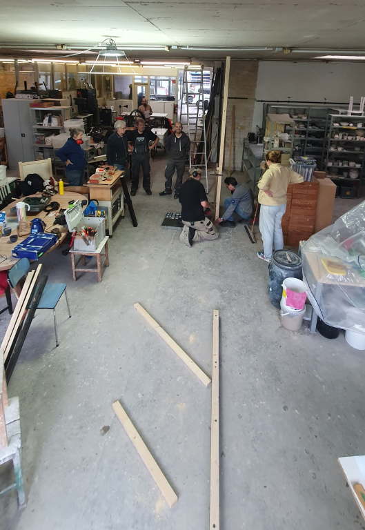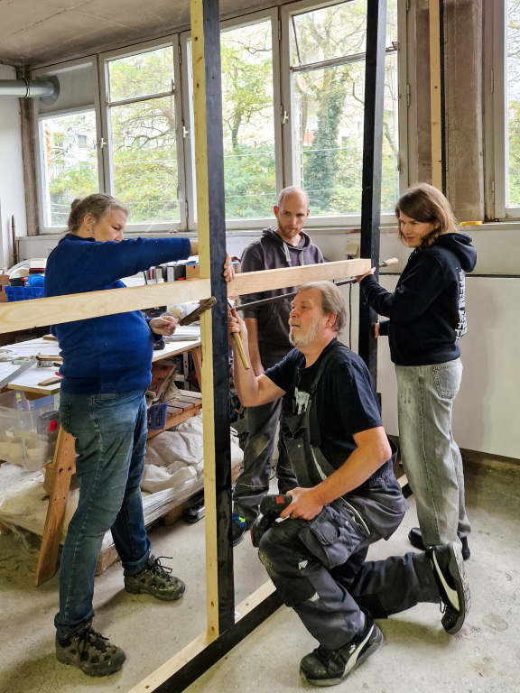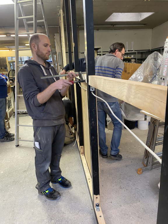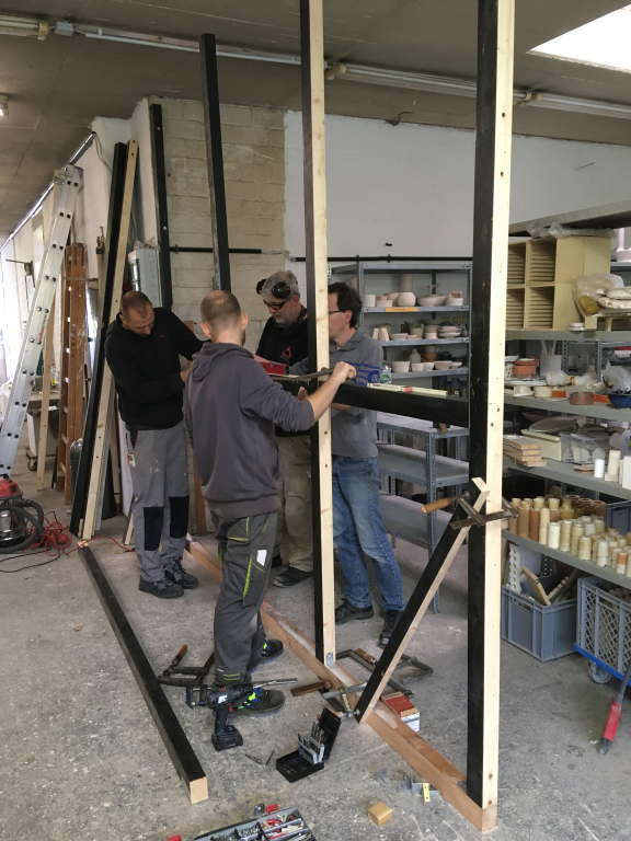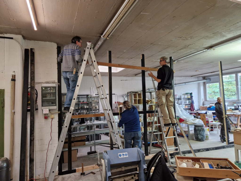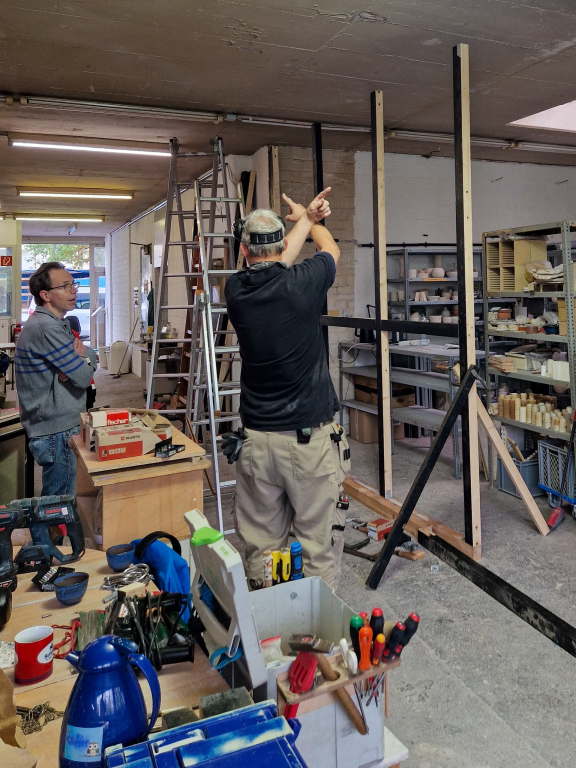 In der Keramikwerkstatt muss der Bereich mit den Brennöfen baulich vom restlichen Areal getrennt sein. Aus diesem Grund benötigen wir eine Trennwand, die im Stil der bereits bestehenden Trennwände der Werkstatträume errichtet werden soll: ein Rahmenbau aus Holz, der unten mit Platten und oben mit Fenstern versehen ist.