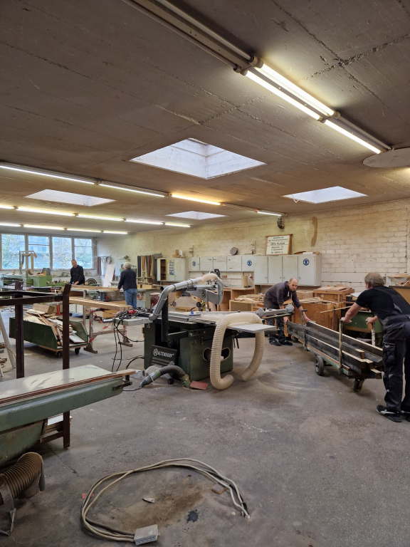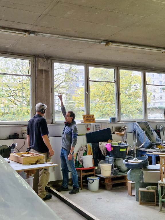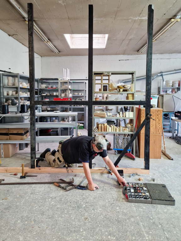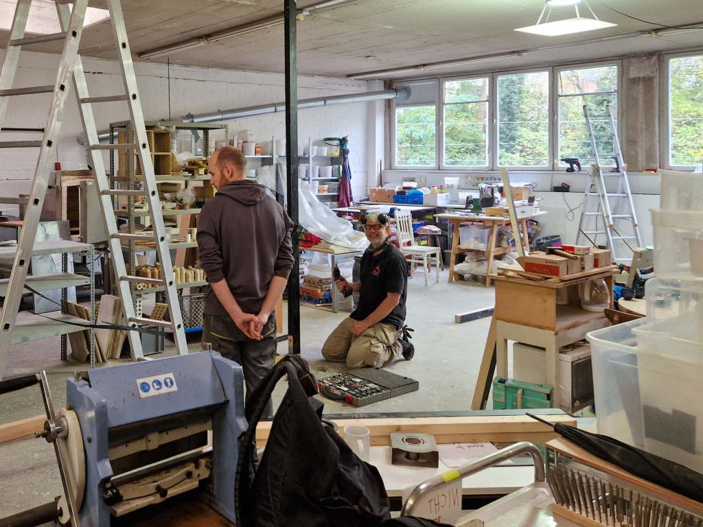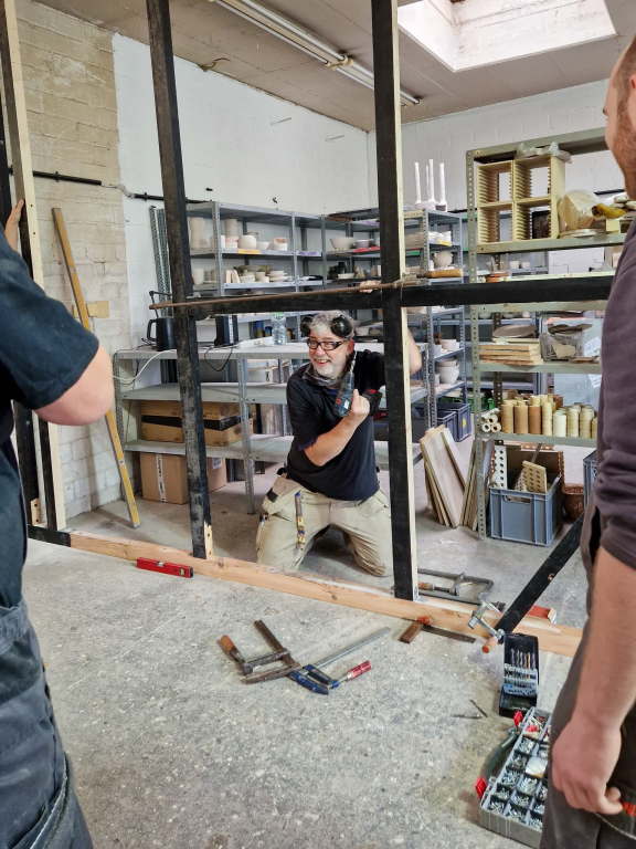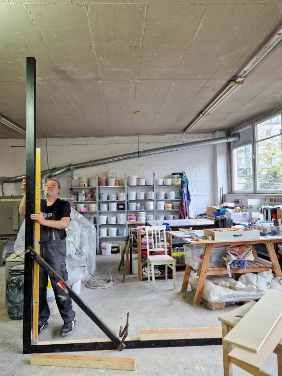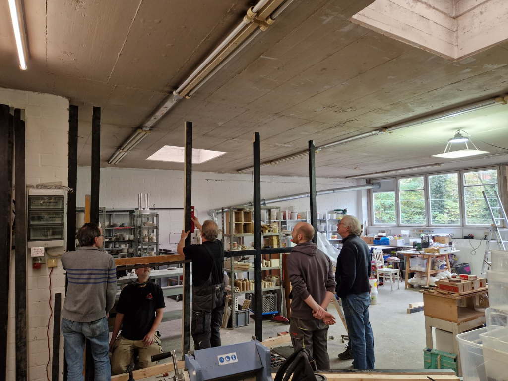 In der Keramikwerkstatt muss der Bereich mit den Brennöfen baulich vom restlichen Areal getrennt sein. Aus diesem Grund benötigen wir eine Trennwand, die im Stil der bereits bestehenden Trennwände der Werkstatträume errichtet werden soll: ein Rahmenbau aus Holz, der unten mit Platten und oben mit Fenstern versehen ist.