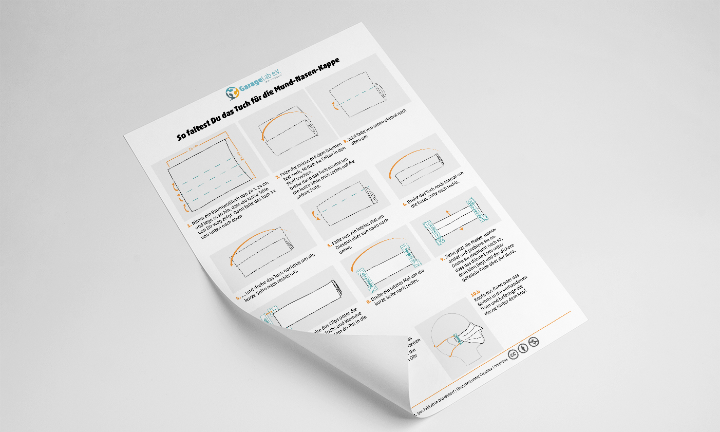 Das GarageLab e.V. übernimmt keine Haftung für die Wirksamkeit, die Herstellung oder die sachgerechte Verwendung des Behelfs-Mund-Nasenschutzes. Jeglicher Schadensersatzanspruch gegenüber dem GarageLab e.V. wegen Verletzung des Lebens, des Körpers oder der Gesundheit – unabhängig ob vom Verwender oder des jeweiligen gegenüber – ist ausgeschlossen.