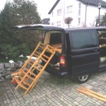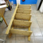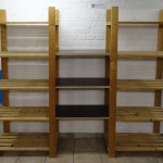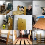 Zum Anderen erhielten wir über eine „zu-verschenken“-Annonce auf kleinanzeigen.ebay von einer Spenderin aus Wülfrath zwei massive Holzregale (Danke Frau V.!). Nach etwas Tüftelei bei der Abholung (man stecke die Regale ineinander), gelang es Holger und Hans-Christian die Regale ins GarageLab zu bringen, wo sie von den beiden wieder zusammengesetzt und an der Wand verschraubt wurden. Dübel, Schrauben und Werkzeuge sind ja im Garage-Lab ausreichend vorhanden. Und um noch etwas mehr Stauraum zu schaffen, wurde kurzerhand eine alte Tischplatte vom Sperrmüll exakt zersägt und die so entstandenen Bretter zwischen den beiden Regalen verschraubt. So werden aus zwei Regalen danke Up- und Recycling mal eben drei.