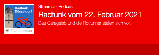 Stefan Schmidt von StreamD – dem Themen-Podcast für Düsseldorf – hat den Garage Lab e. V. interviewt. In seiner achten Sendung „Radfunk“ wirft er mit dem ADFC und den Rotrunnern zusätzlich einen Blick auf die Situation für Radfahrende in Düsseldorf. Den Podcast vom 22. Februar 2021 jetzt auf StreamD anhörenStreamD Radfunk Podcast vom 22.02.2021 Ab […]
