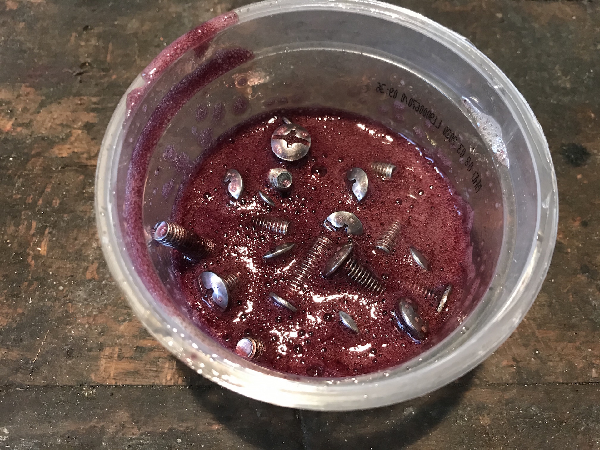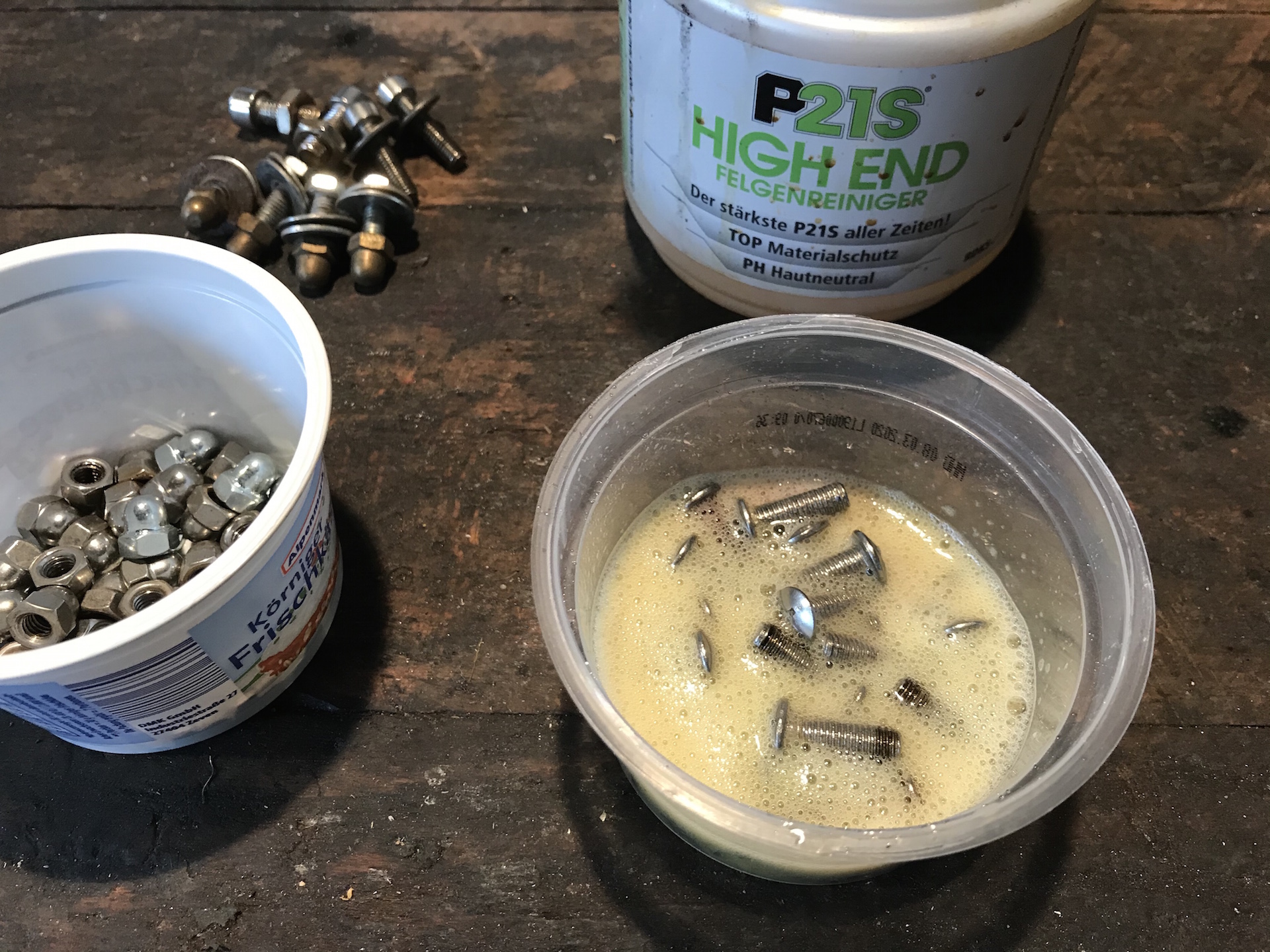 Als Erstes wurden dazu alle Schrauben in ein sensationelles Rostlösemittel eingelegt: