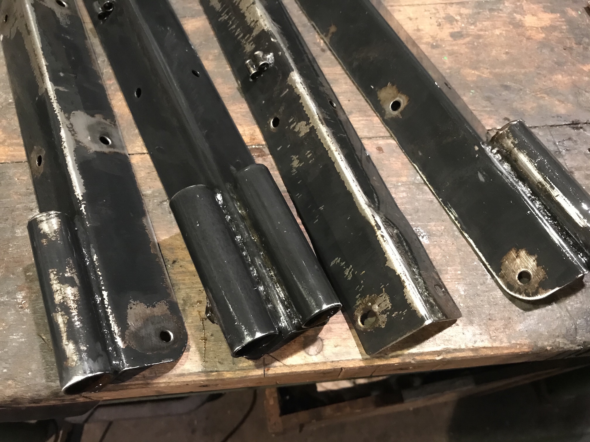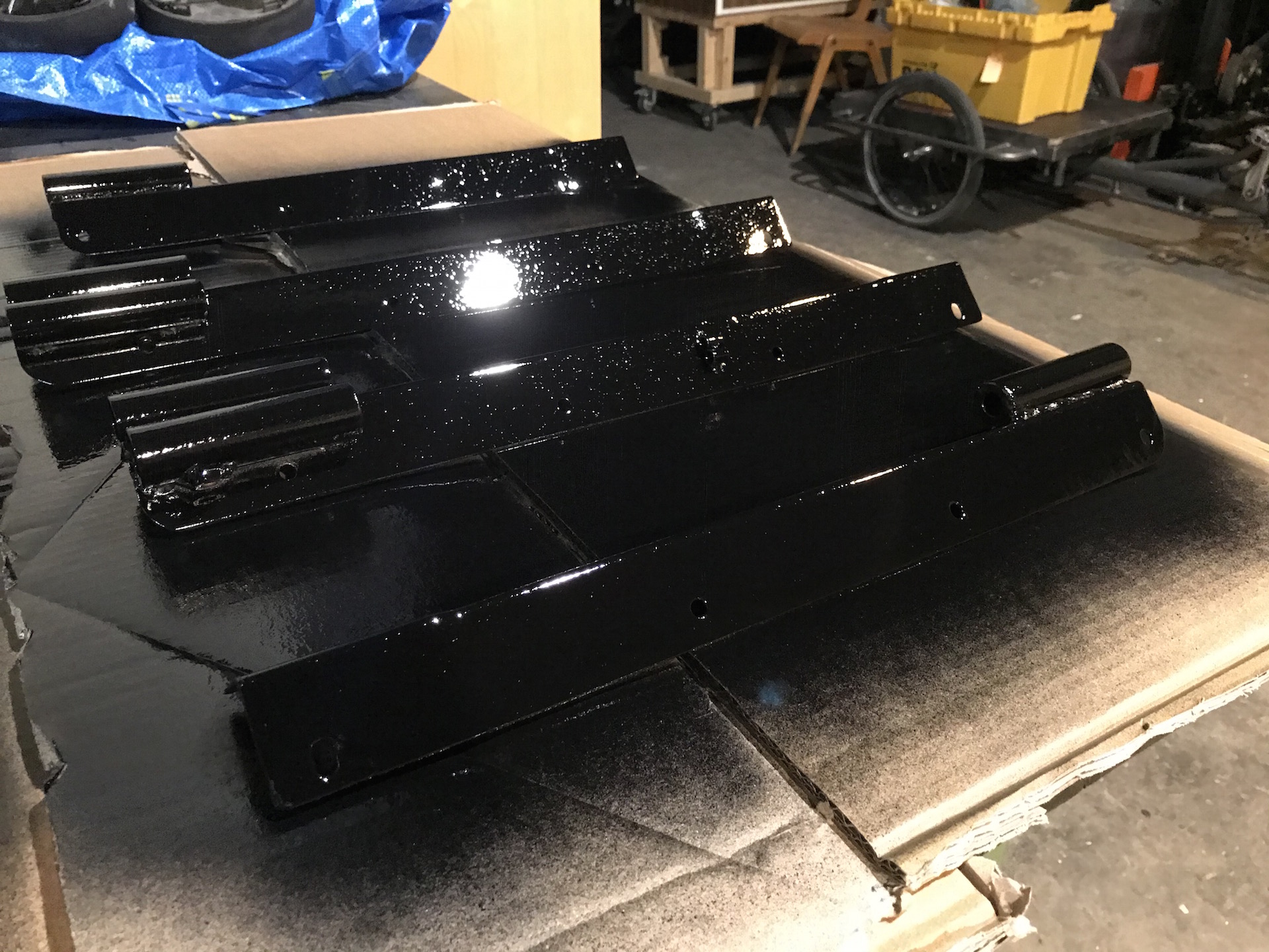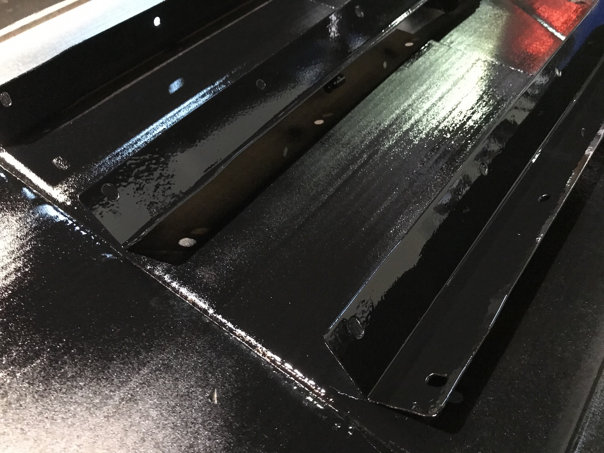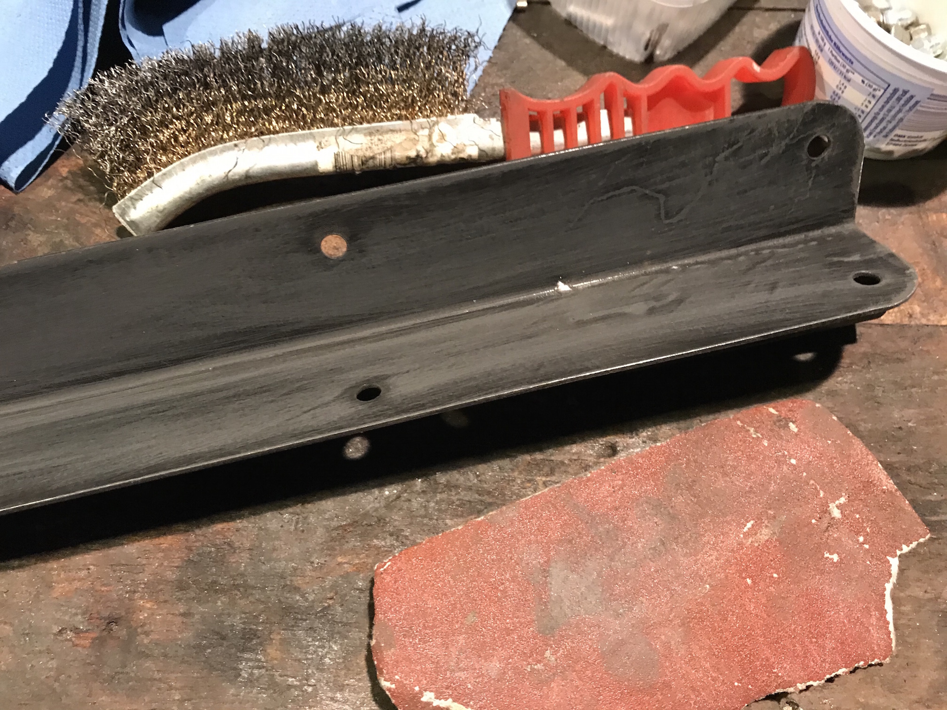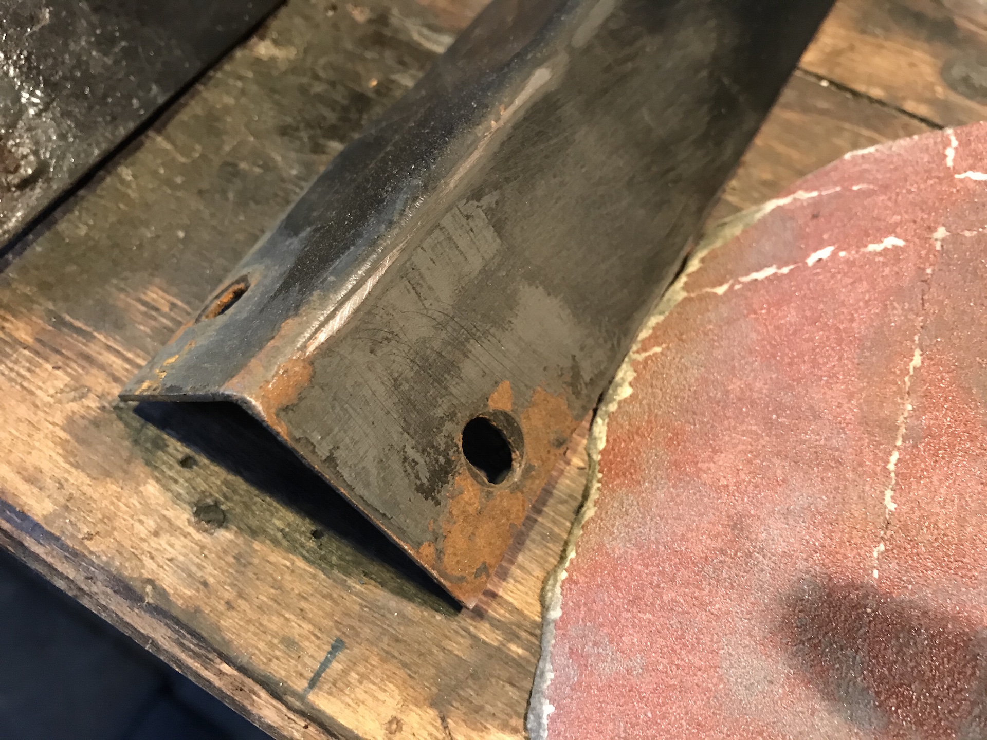 Dann haben wir die Winkelbleche mit der Flex und von Hand ab- und angeschliffen, um den neuen Lack aufzubringen: Schwarz glänzend! Die Winkel sehen frisch lackiert und mit den entrosteten Schrauben montiert wie neu aus.