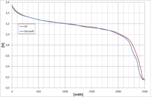 Trotz des 7,5 fachen Preises schneiden beide Batterien gleich gut ab(!) Ganz streng genommen ist die günstigere Batterie sogar etwas besser, da sie erst einige mAh später unter 1V fällt.
