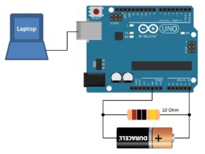 Die Batterie wird über einen 10 Ohm Widerstand entladen. Die Spannung der Batterie wird über einen Analogeingang des Arduino gemessen. Die Spannung entspricht in diesem Aufbau auch gleichzeitig dem Spannungsabfall über den Widerstand, woraus sich der aktuelle Strom berechnen lässt: I = U / R.