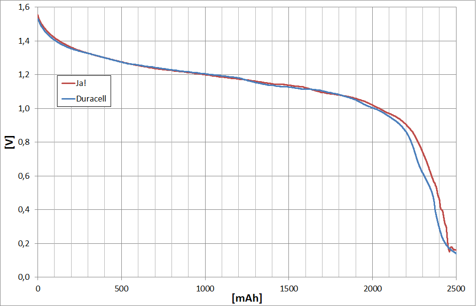Trotz des 7,5 fachen Preises schneiden beide Batterien gleich gut ab(!) Ganz streng genommen ist die günstigere Batterie sogar etwas besser, da sie erst einige mAh später unter 1V fällt.
