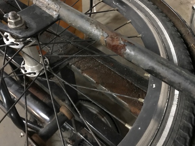 Nachdem wir die Bretter und die Bodenplatte demontiert hatten, sind auch viele rostige Stellen zum Vorschein gekommen. Nichts dramatisches und auch strukturell nicht gefährlich, aber auch nichts, was man so lassen sollte. Wir überlegen noch, wie wir das behandeln. Toll wäre natürlich, wir fänden jemand, der den Rahmen sandstrahlt und neu pulverbeschichtet (*träum*) …