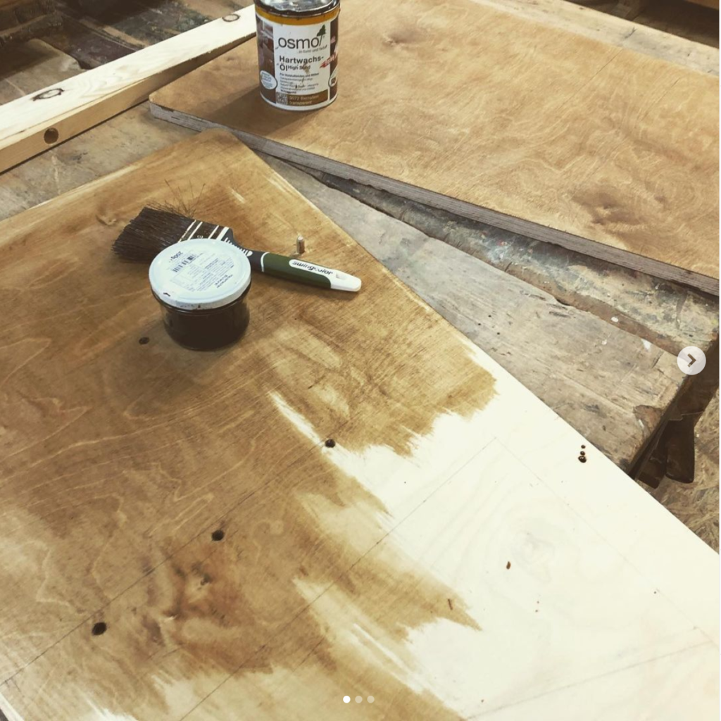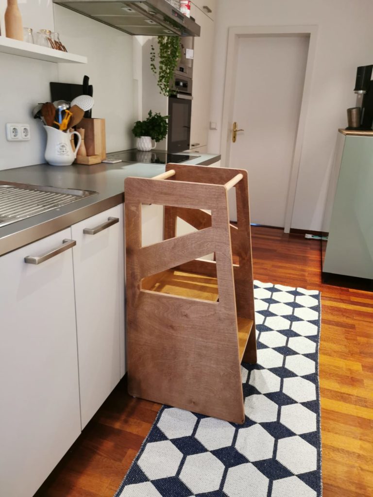 Schnell ans nächste Projekt. Wir werden bald einen Lernturm für die Küche brauchen, einen Hocker mit Stufen damit auch die ganz Kleinen auf die Arbeitsfläche gucken können. Und helfen?! Wie werden sehen. Einen für über 100 Euro zu kaufen macht keinen Spaß. Den allseits bekannten Ikea Hack nachzubauen ist mir zu provisorisch. 1,2qm Birken multiplex ist gekauft. Beizen. In Form sägen. Und dann ‚zam bauen. So simpel klingt der Plan. Mal sehen wie lange es dauert. Aus den Rechtecken sind schon vor zwei Wochen die Seitenteile zurecht geschnitten worden. Jetzt ist es an der Zeit dem Birkensperrholz eine schöne Farbe zu verpassen. Wie immer ergibt sich die angestrebte Farbe aus einer Kombination mehrerer Komponenten. Erst mit verdünnter Nussbaumbeize gestrichen, dann Öl eingearbeitet. Ich bin mir allerdings noch nicht sicher, dass dies die finale Farbe ist. Ausschnitte fertig! Rundrum vorwärts und rückwärts geschliffen. Kein Splitter für kleine Hände! Jetzt finalisiere ich noch die Farbe. Schließlich fehlen noch ein paar Bohrungen und ein paar Holzdübel. Fertig ist der Lernturm!