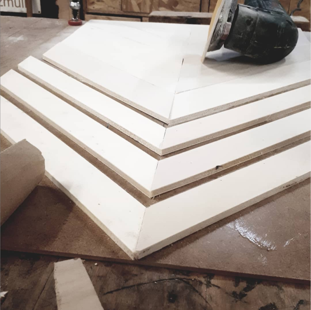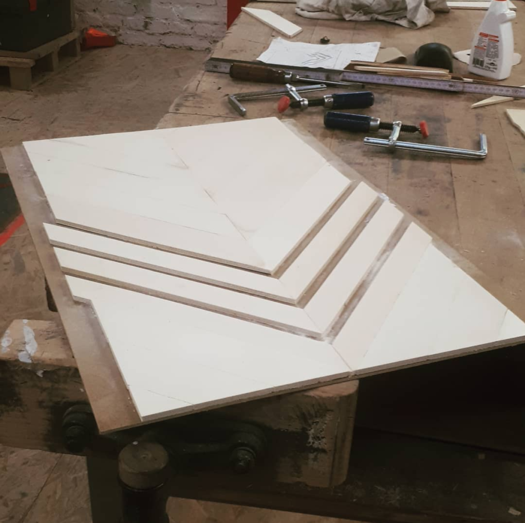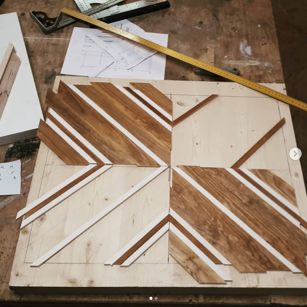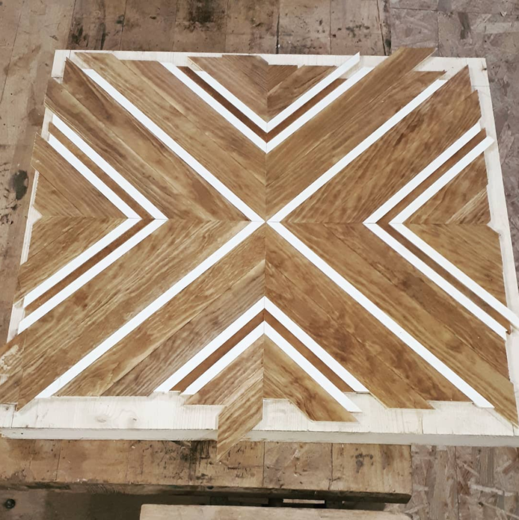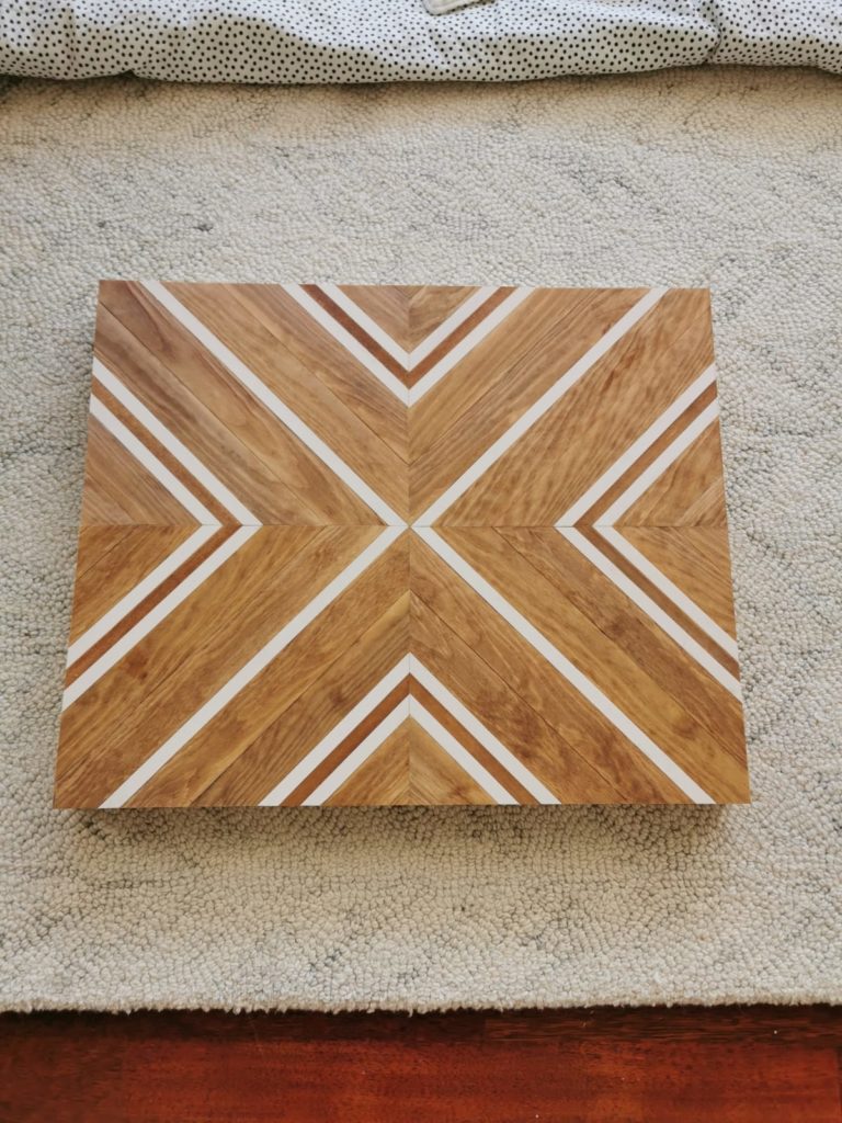 Ich träume schon wieder von 45 Grad Winkeln. Ich habe meterweise Leisten an der neuen Kappsäge zugeschnitten und trotz ausgetüftelter Skizze habe ich mich wohl ordentlich verrechnet. Das Holz reicht nur für 3 Quadranten. Also Nachschub holen! Kenn ich ja schon… die Tischplatte muss erstmal warten. Geometry in progress . Inzwische ist das Muster komplett gelegt und geleimt! Als Interims-Wallart. Um die Tischplatte später zu vollenden, möchte ich noch eine Verblendung anbringen. Die entsprechende Fräse ist allerdings gerade kaputt. Also übe man sich in Geduld. In der Zwischenzeit dekoriert das Stück unsere Essecke!