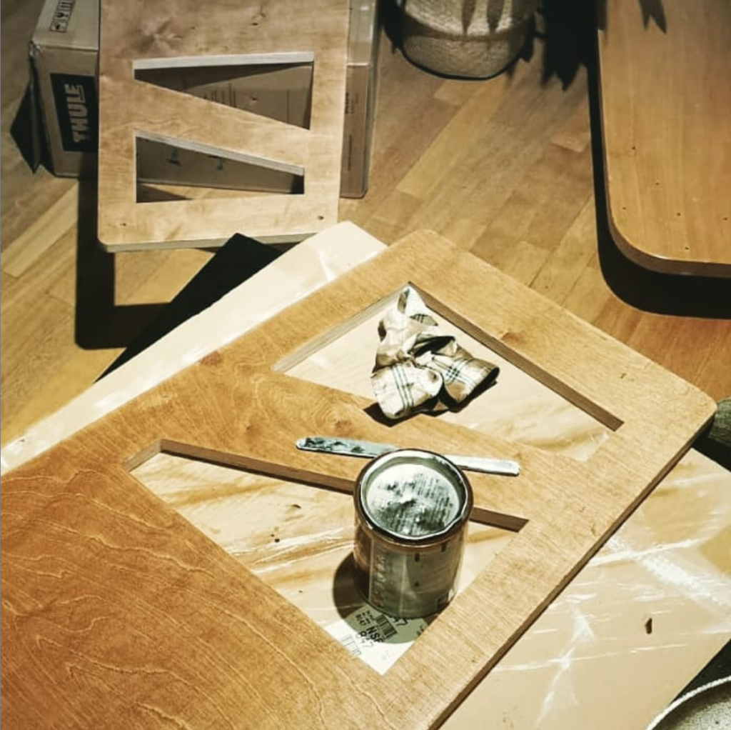Corinna hat die Zeit in den Sommermonaten genutzt, um in der Holzwerkstatt trotz Beschränkungen einige Projekte umzusetzen. Sie baute eine Bücherbox für den Nachwuchs, einen Kletterturm für den Kleinen für die Küche, ein Kunstobjekt, das später noch zur Tischplatte eines Beistelltischs werden wird und Schiebetüren für ein Sideboard.