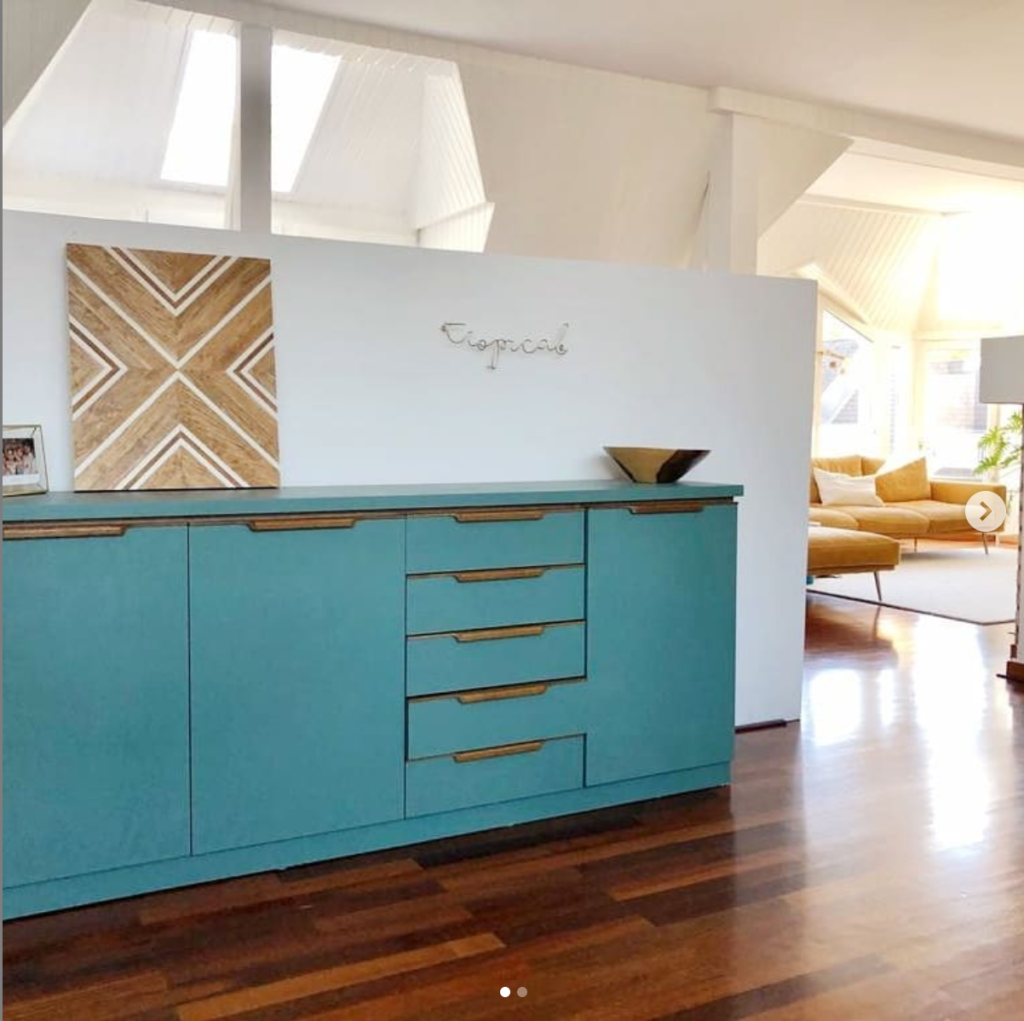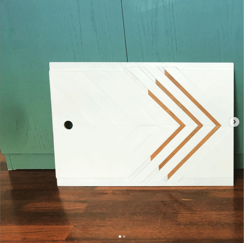 Holzgeometrie Teil zwei. 45 Grad Winkel faszinieren mich. Dieses sollen Schiebetüren fürs Sideboard werden. Erst mal alles zusägen. Dann streichen. Dann Einsätze einbringen… Loch bohren. Schließlich eine der beiden die fertigen Türen.