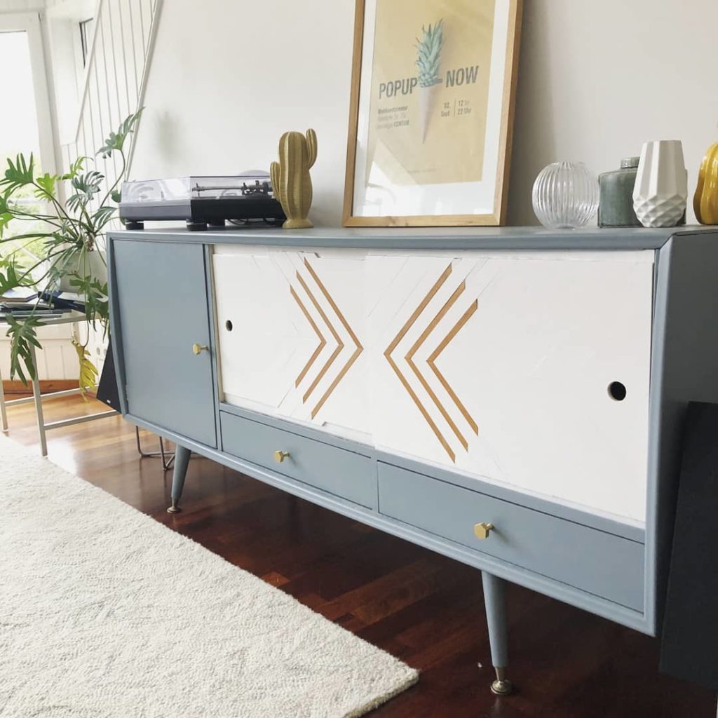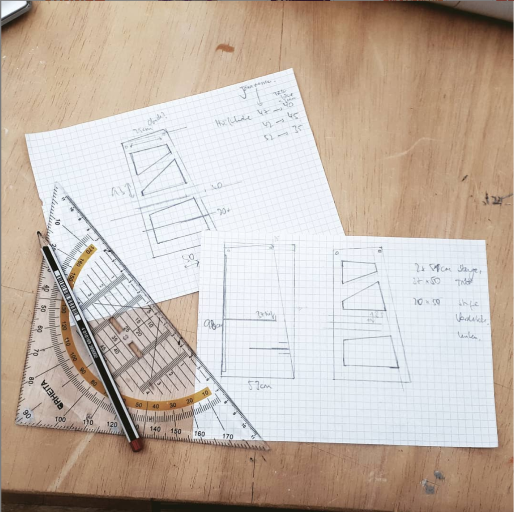 Holzgeometrie Teil zwei. 45 Grad Winkel faszinieren mich. Dieses sollen Schiebetüren fürs Sideboard werden. Erst mal alles zusägen. Dann streichen. Dann Einsätze einbringen… Loch bohren. Schließlich eine der beiden die fertigen Türen.