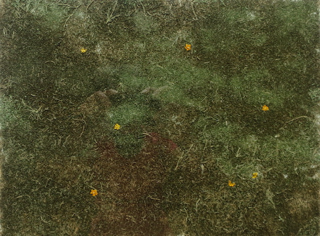 „Les étoiles de la forêt“, 2021, Brennessel, Schlüsselblumen, Agar-Agar auf Papier, 24cm x 32cm