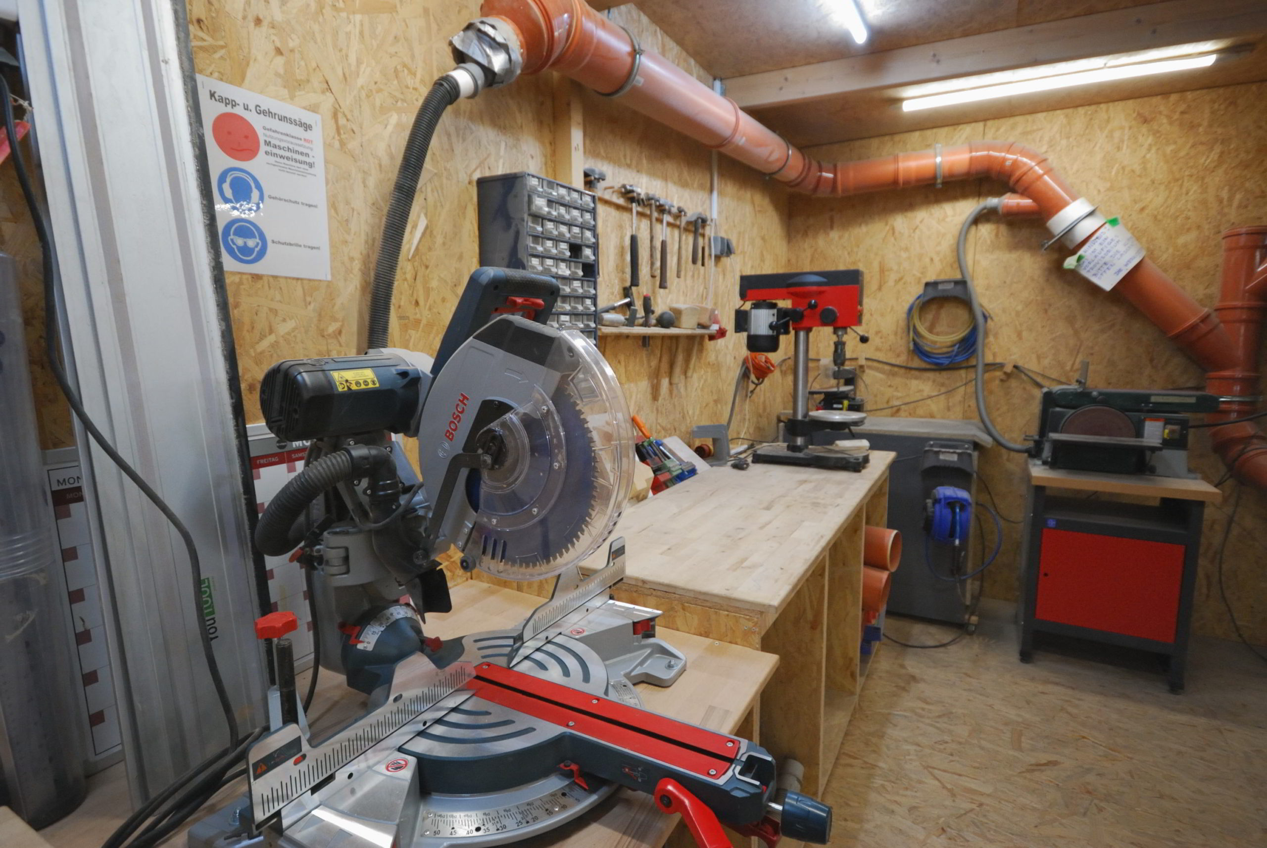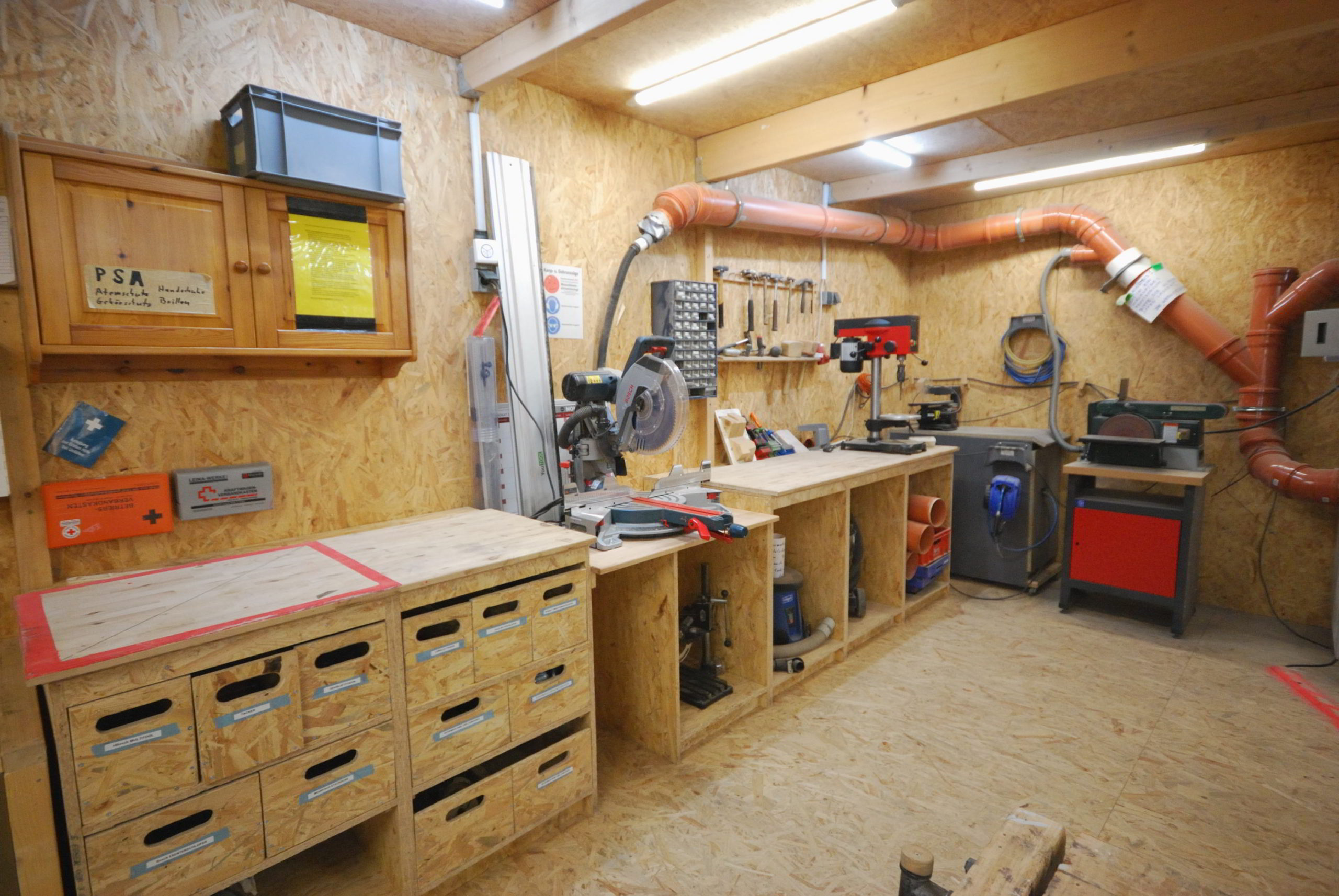 Das GarageLab verfügt über eine gut ausgebaute und eingerichtete Holzwerkstatt.