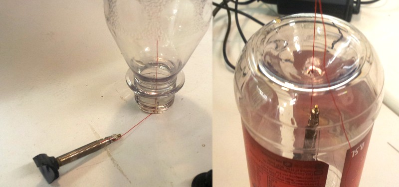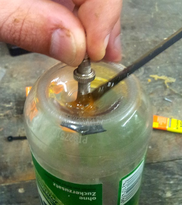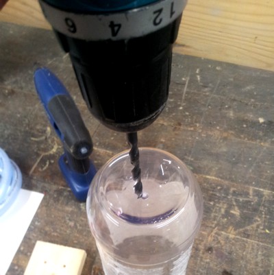 Wir behelfen uns eines einfachen Tricks: Draht oder Bindfaden. Drehe die Flasche auf den Kopf, so dass dass das gebohrte Loch oben ist. Führe nun einen Draht / Bindfaden durch das Loch und lasse ihn unten durch die Flaschenöffnung laufen. Das kann ein wenig knifflig sein, wenn ihr einen Faden verwendet. Er ist halt sehr leicht. Als Trick kannst Du z.B. eine Büroklammer zurecht biegen. Es dient dann als Gewicht. Ein Tropfen Heißkleber tuts auch.