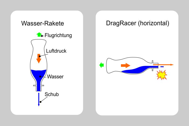 Die normale Rakete hat den Vorteil, dass das Wasser durch die Schwerkraft stets in die Richtung der Düse will. Wir wollen aber nicht nach oben, sondern zur Seite. Würden wir einfach eine normale Wasserrakete um 90° drehen, würde das Wasser sich unten in der Flasche sammeln und die Luft könnte problemlos durch die Düse entweichen. Sieht nett aus, ergibt aber einen kläglichen Schub.