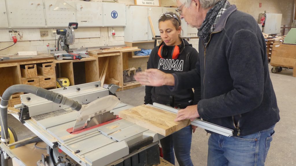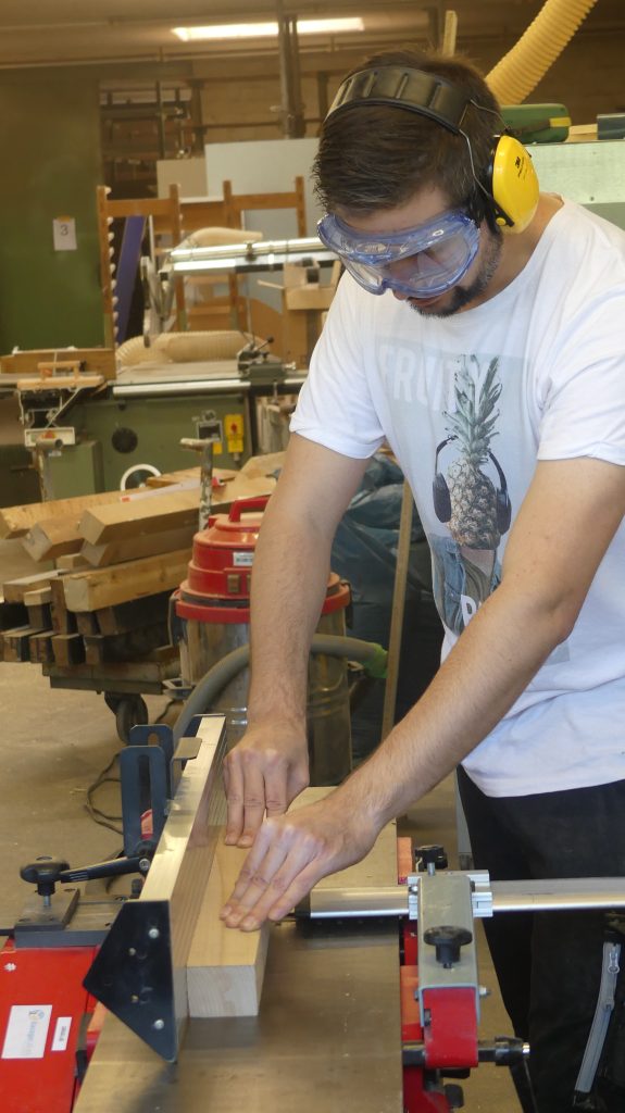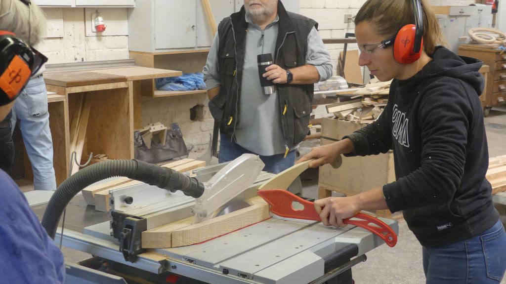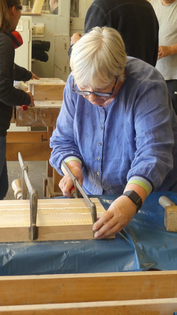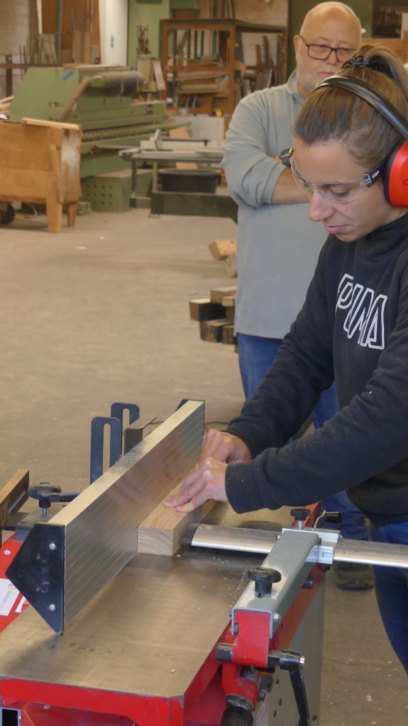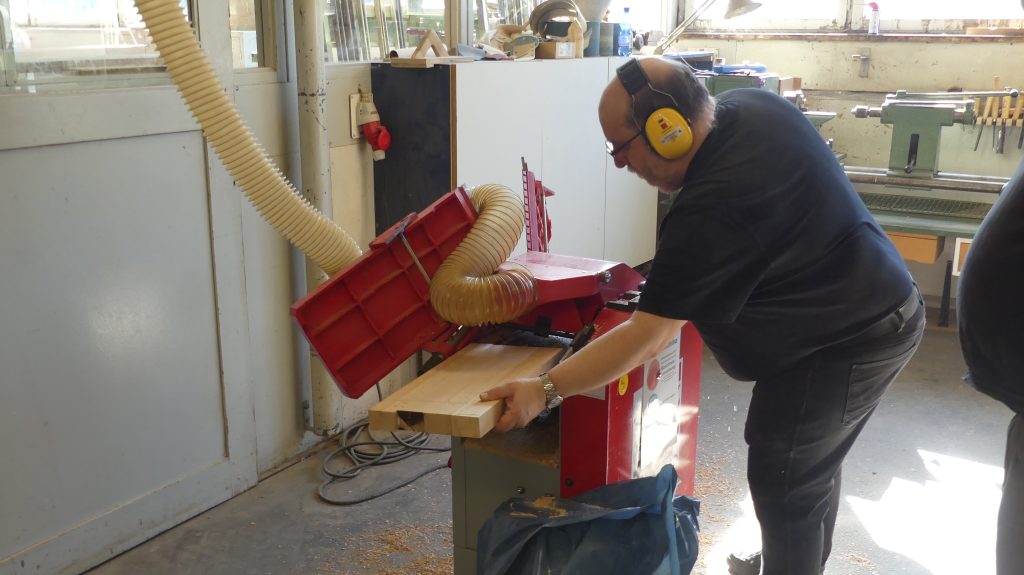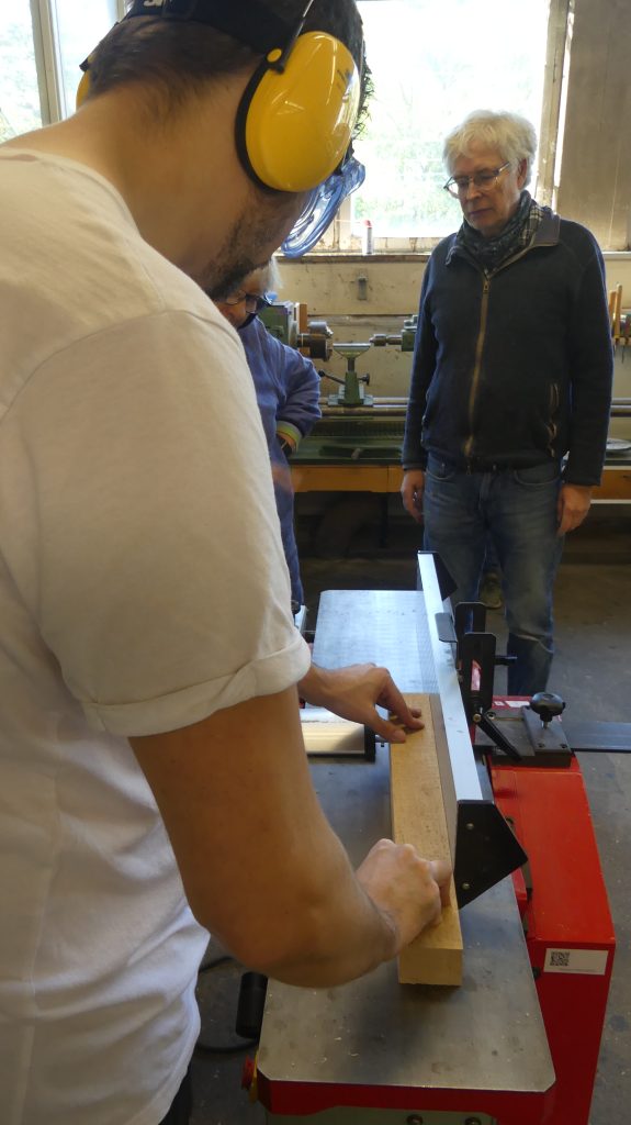 Die einzelnen Arbeitsschritte wurden ebenfalls noch einmal ausführlich besprochen. Und nachdem sich jeder ein Stück Holz aus dem Fundus ausgesucht hatte, ging es auch schon an die Maschinen, um aus dem Ausgangsmaterial die ersten Stäbe zu sägen und diese dann rechtwinklig zu hobeln.