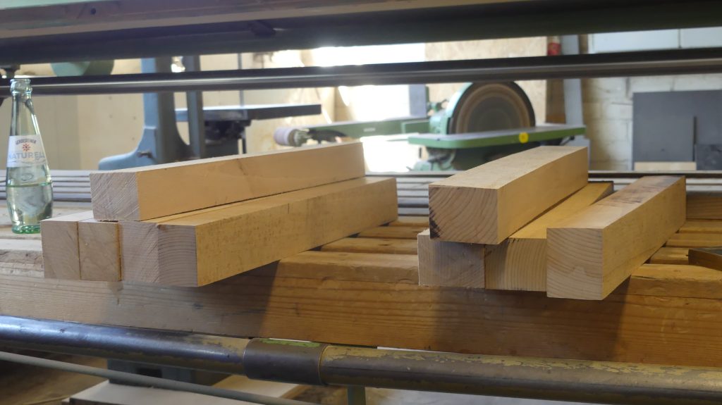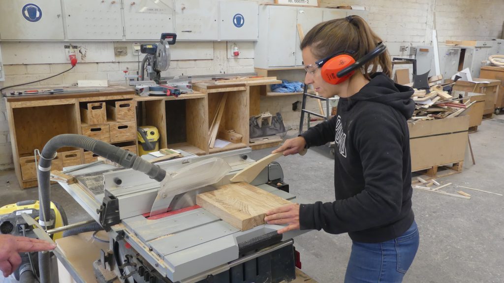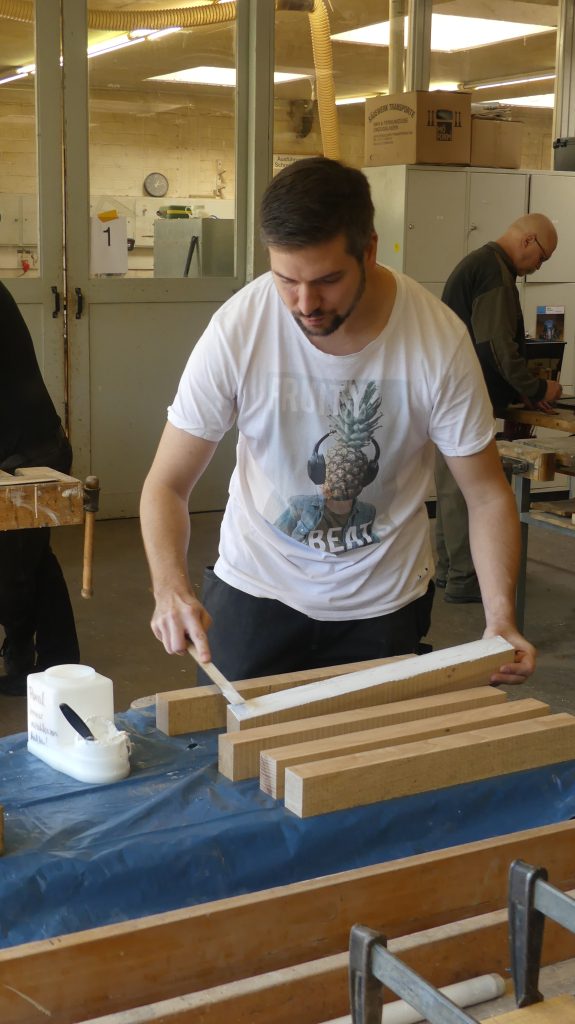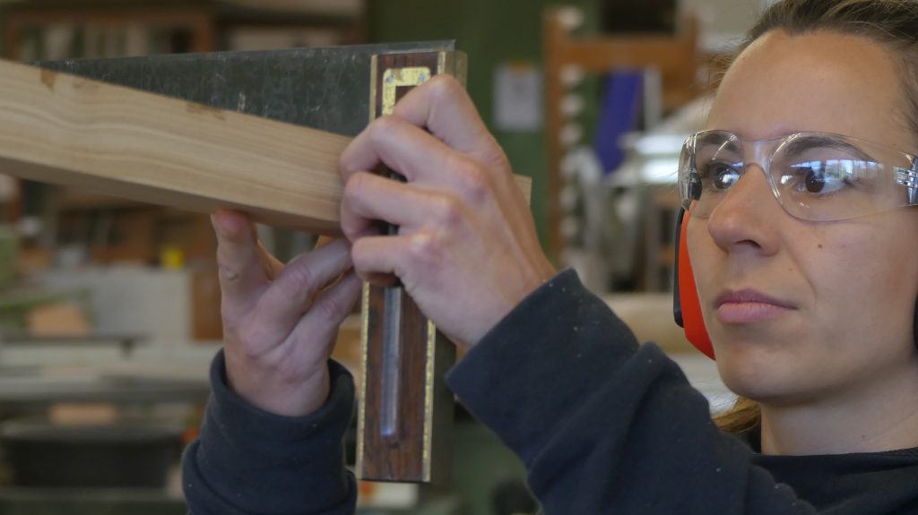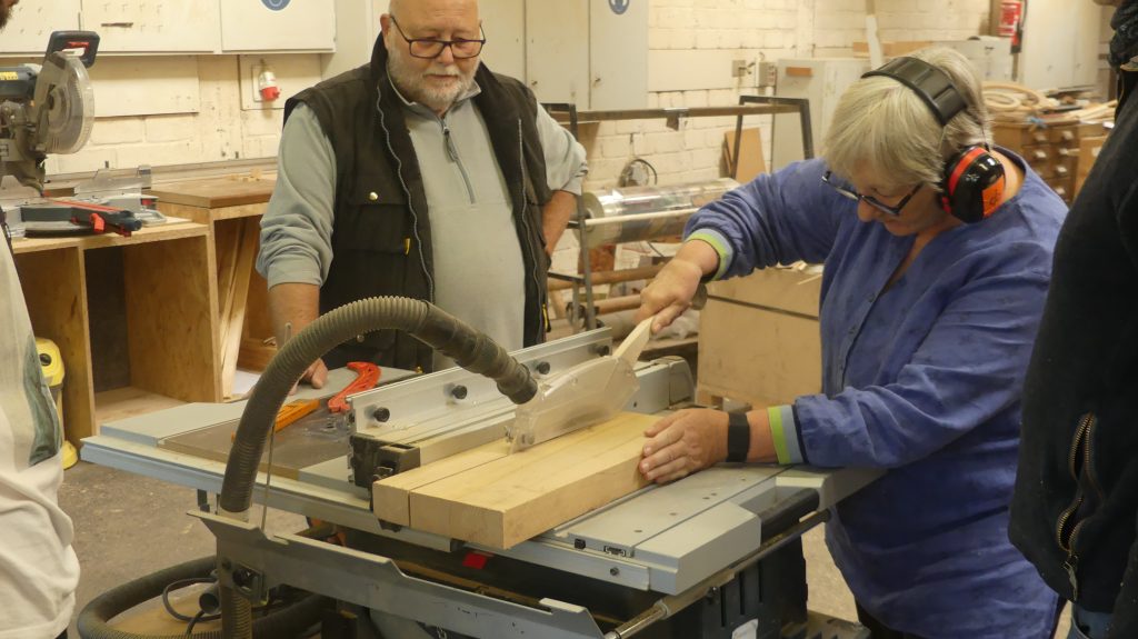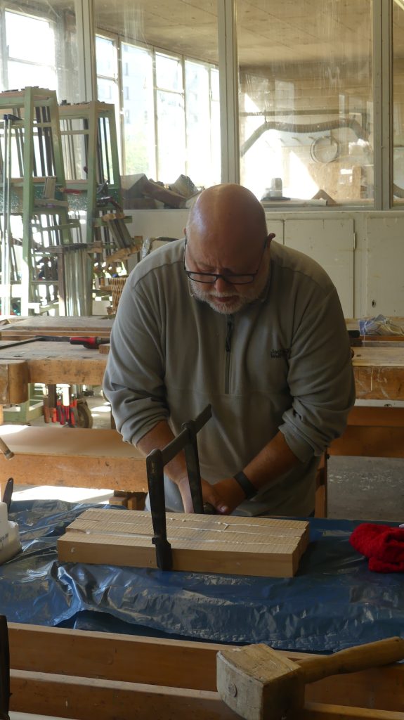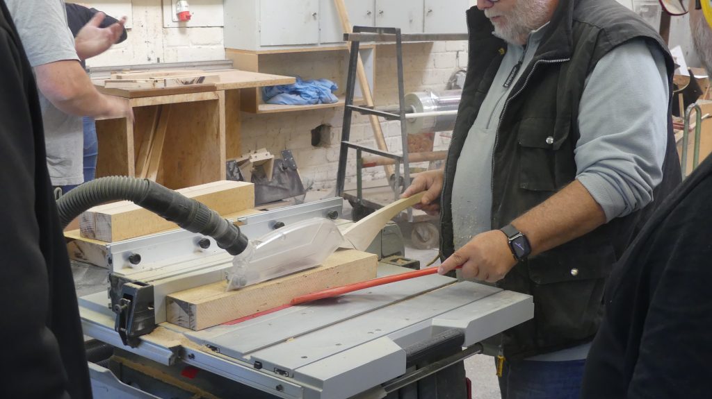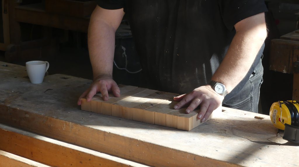 Die einzelnen Arbeitsschritte wurden ebenfalls noch einmal ausführlich besprochen. Und nachdem sich jeder ein Stück Holz aus dem Fundus ausgesucht hatte, ging es auch schon an die Maschinen, um aus dem Ausgangsmaterial die ersten Stäbe zu sägen und diese dann rechtwinklig zu hobeln.