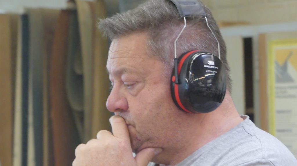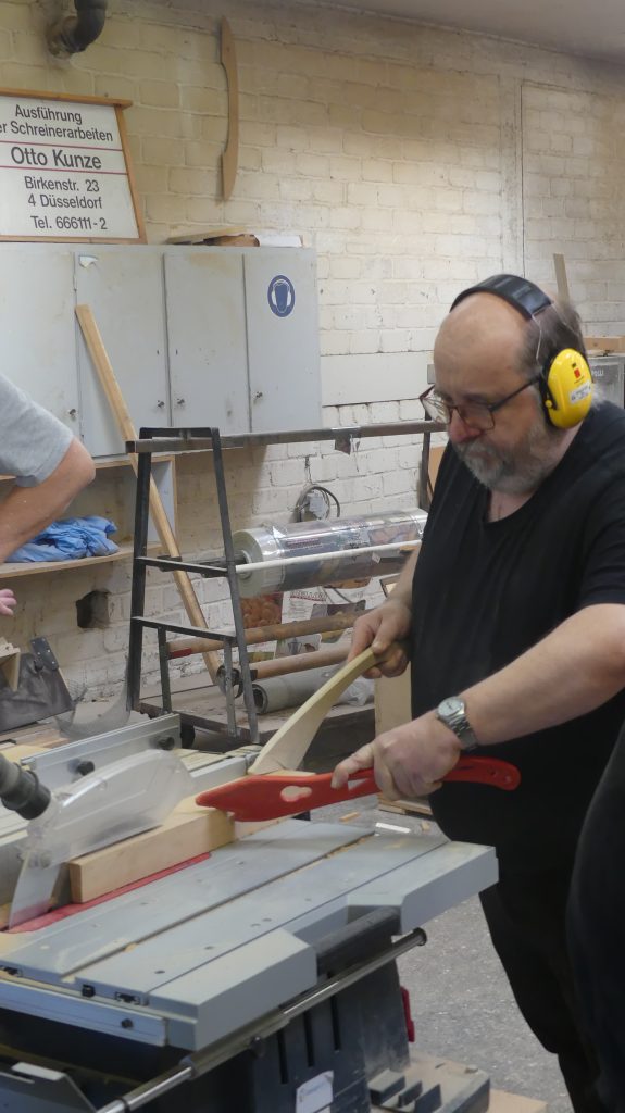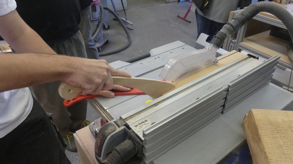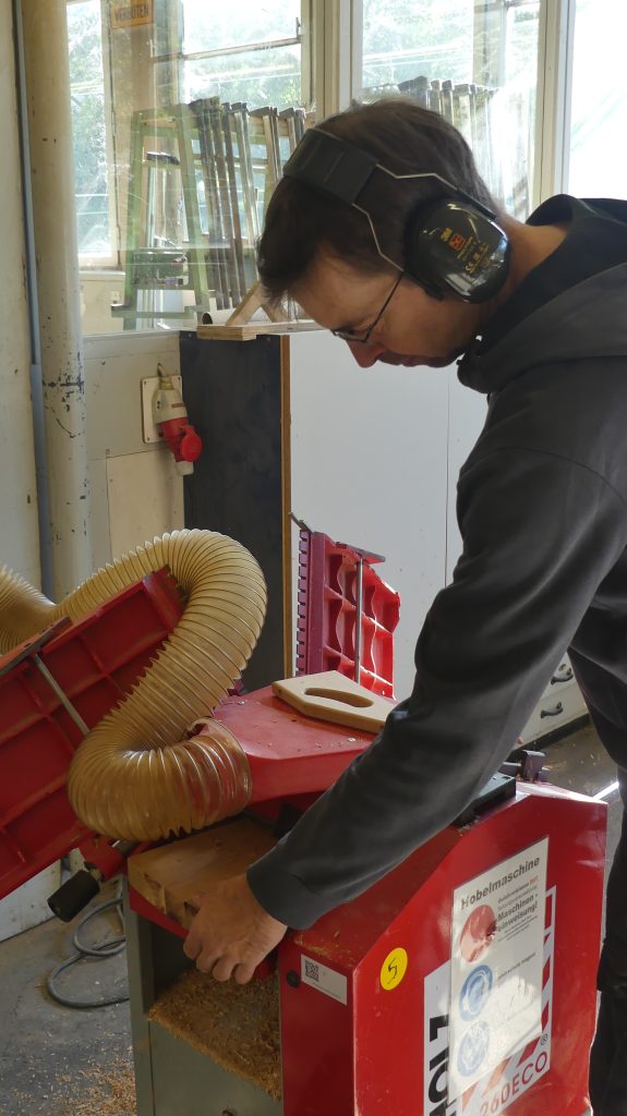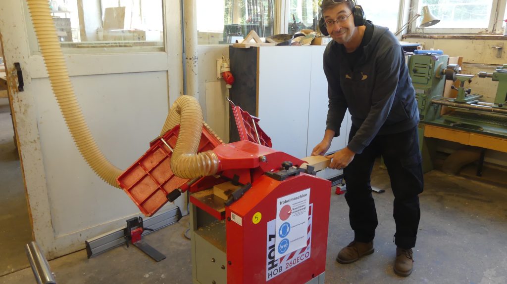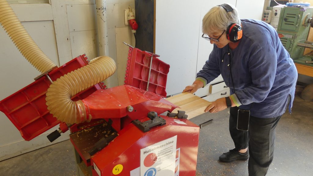 „So ein Brett läßt sich an einem Tag anfertigen. Dabei kommen vor allem die Tischkreissäge, die Hobelmaschine und die Bandschleifmaschine zum Einsatz.“ Zusätzlich zur Maschineneinweisung zeigte Rolf also, was man mit den Maschinen machen kann.