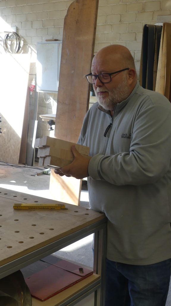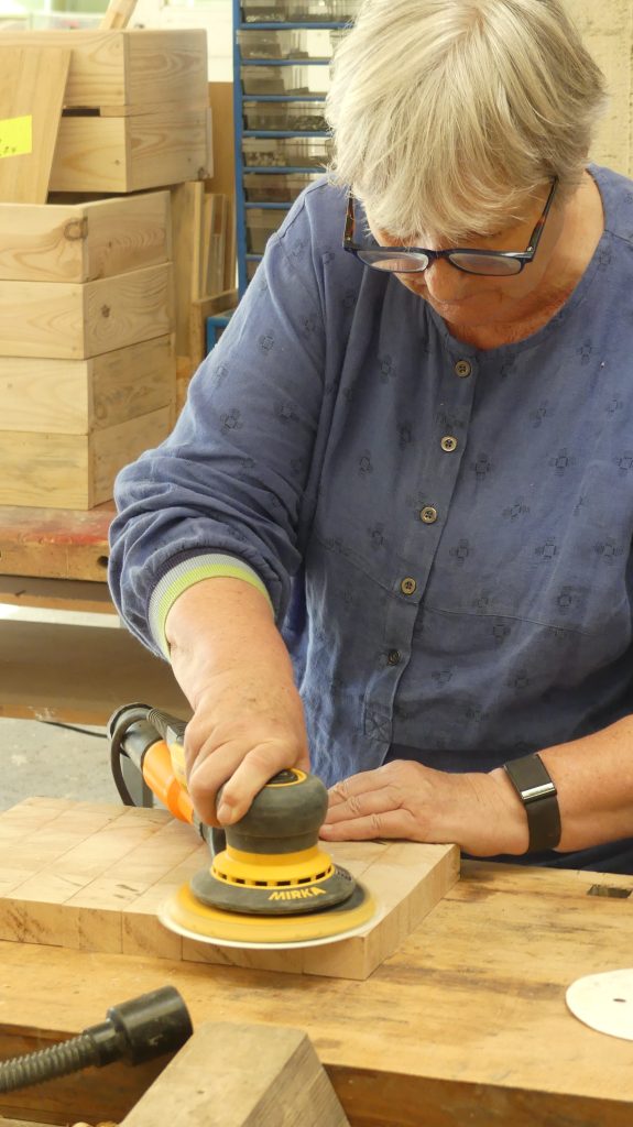 Obwohl bei mir der Holzwurm drin war und ich kein fertiges Werkstück nach Hause tragen konnte, bin ich begeistert von diesem von Rolf kompetent geleiteten Workshop. Ich habe mich an Holzwerkstatt-Geräte gewagt, die ich zuvor nicht kannte und eher großen Respekt davor hatte. Rolf war bei jedem neuen Arbeitsschritt an meiner Seite. Vielen Dank dafür, lieber Rolf.