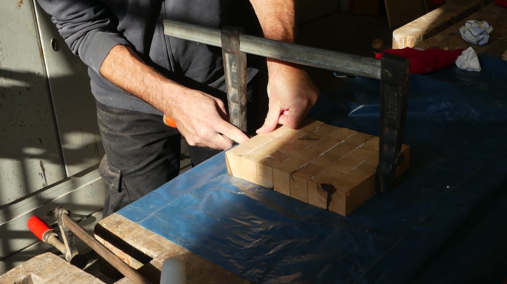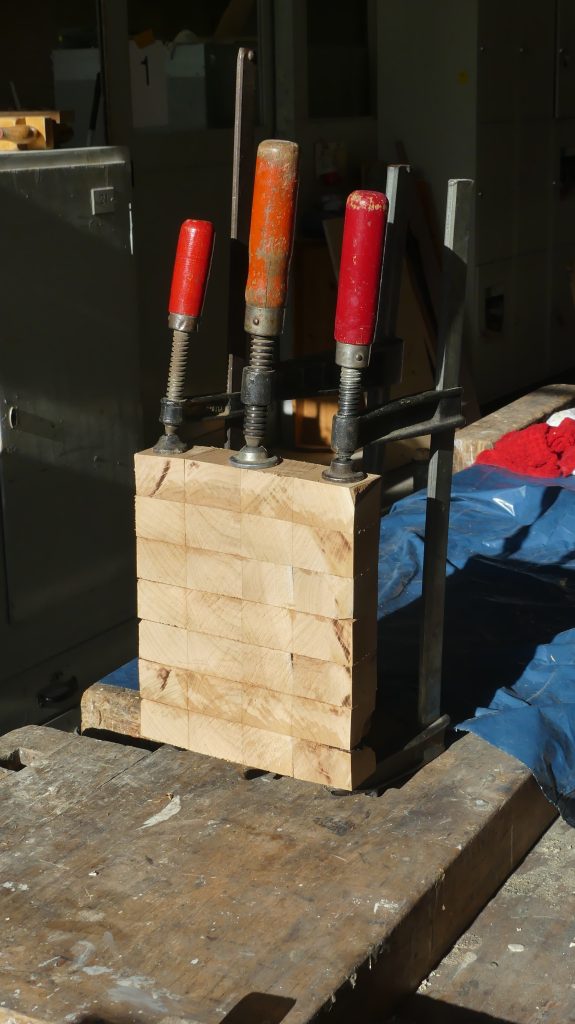 Die quer verleimten Segmente wurden nun mit den zuvor glatt gehobelten Seiten erneut verleimt, woraus dann das fast fertige Schneidebrett aus den einzelnen Würfeln entstand.
