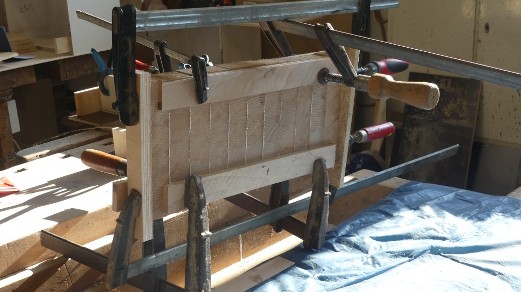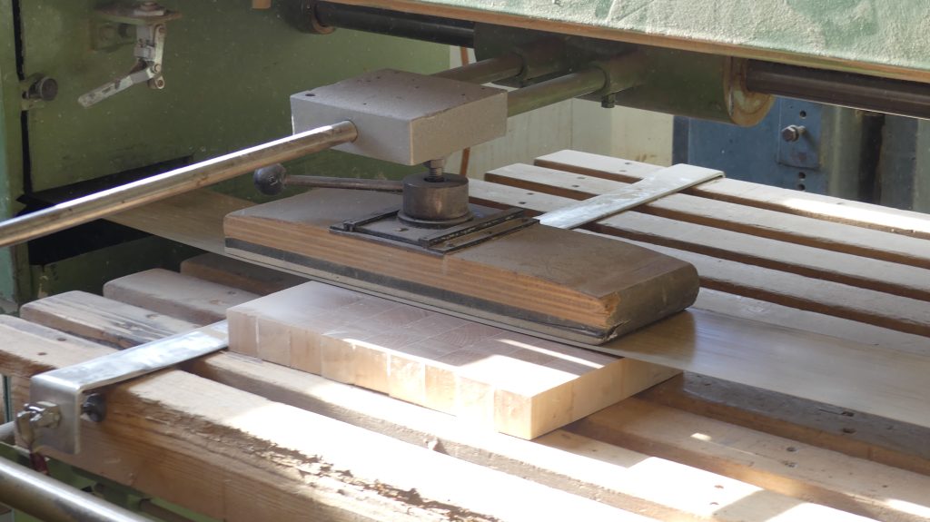 Im nächsten Schritt wurden die Stäbe verleimt, das entstandene Werk noch einmal gehobelt und danach quer gesägt, womit nun auch die Dicke des Schneidebrettes festgelegt war.
