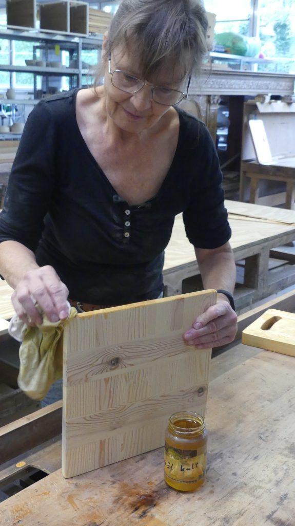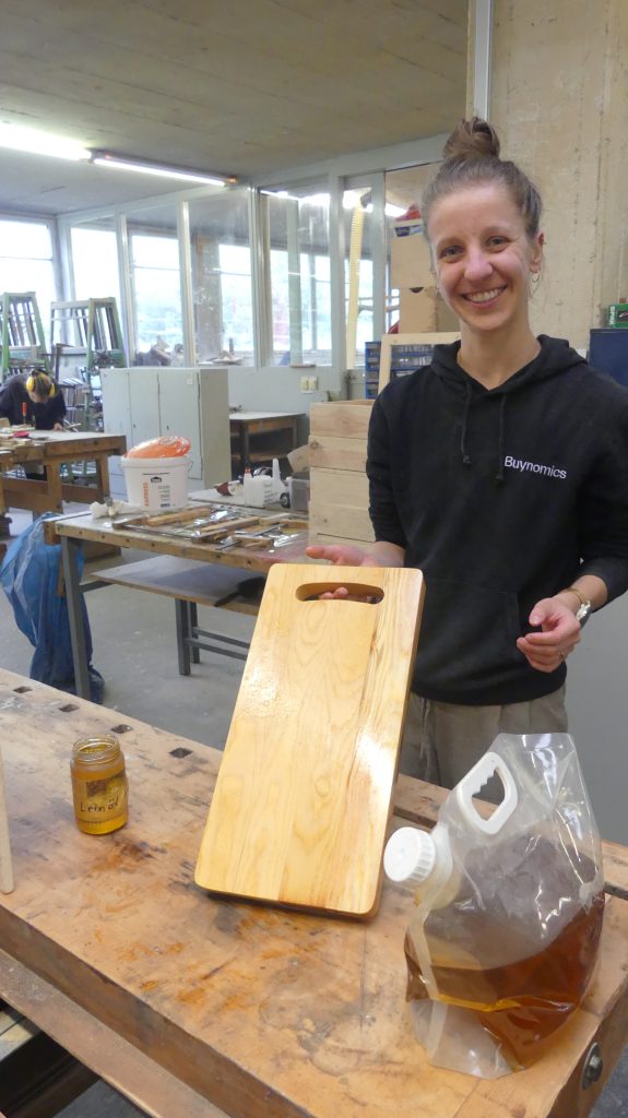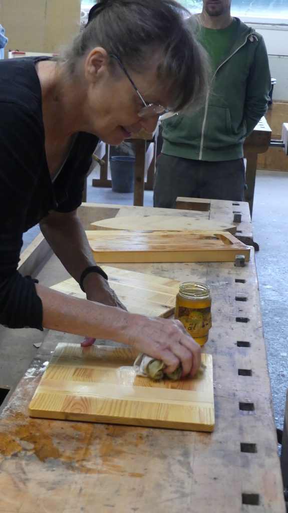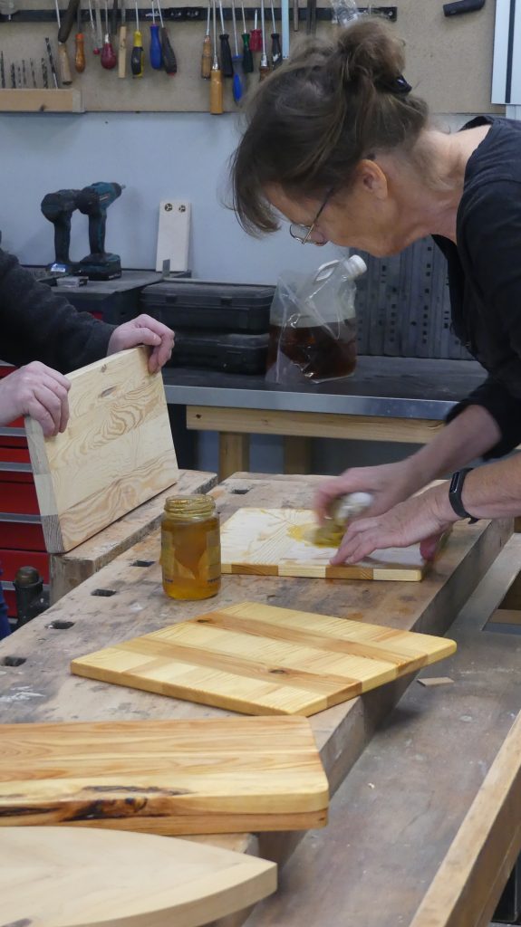 Einige der fertigen Servierbretter wurden am Ende noch mit reinem Leinöl behandelt, das die Maserung des Holzes sehr schön anfeuerte und auch die unterschiedlichen Muster hervorhob.