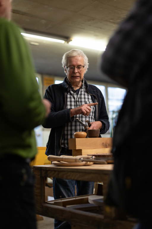 Heute wurde weder gehobelt, noch gesägt oder geleimt. Rolf hatte die Mitglieder des GarageLab eingeladen, damit sie Drechseln lernen können: