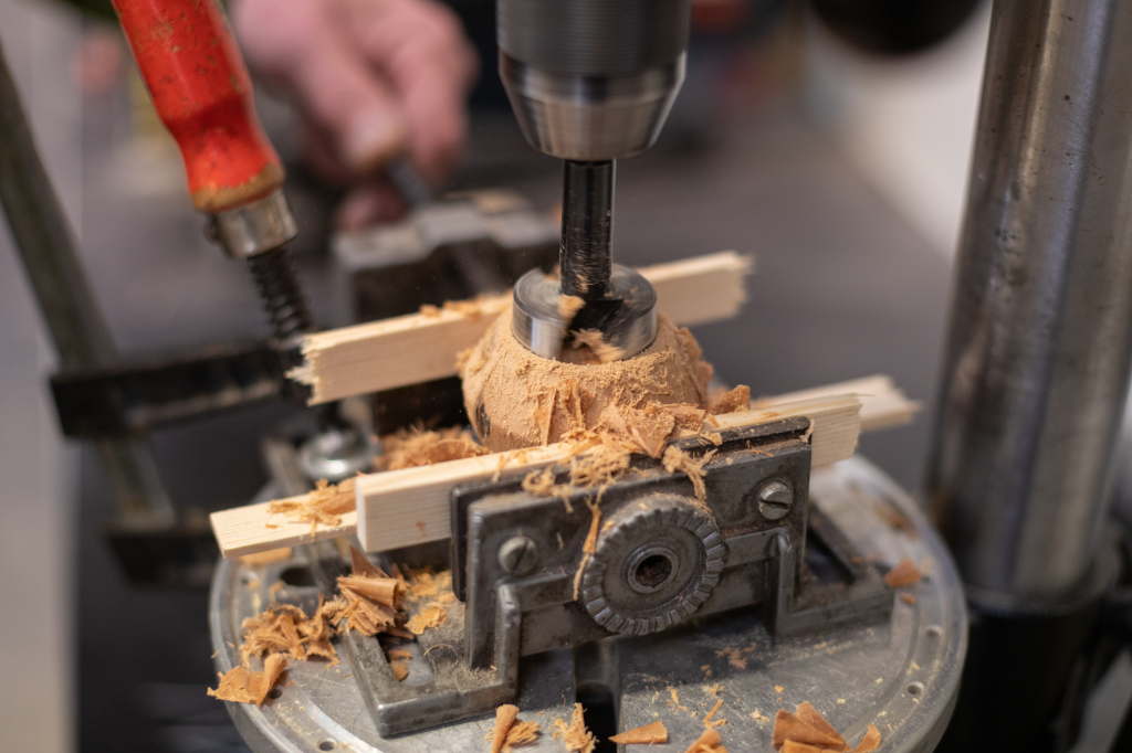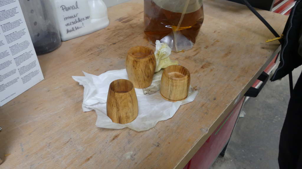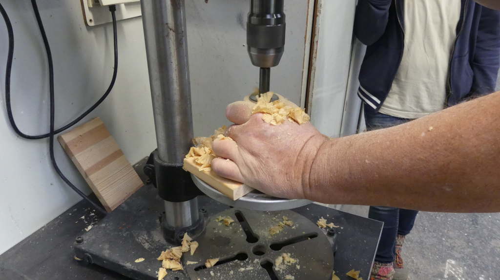 Der Eine oder die Andere zeigten sich dann auch direkt sehr kreativ, und es entstanden recht schnell die Teelichthalter. Mit einem Forstnerbohrer erhielten die dann noch ein passendes Loch für die Teelichter. Abschließend wurden einige der angefertigten Stücke mit Leinöl behandelt.