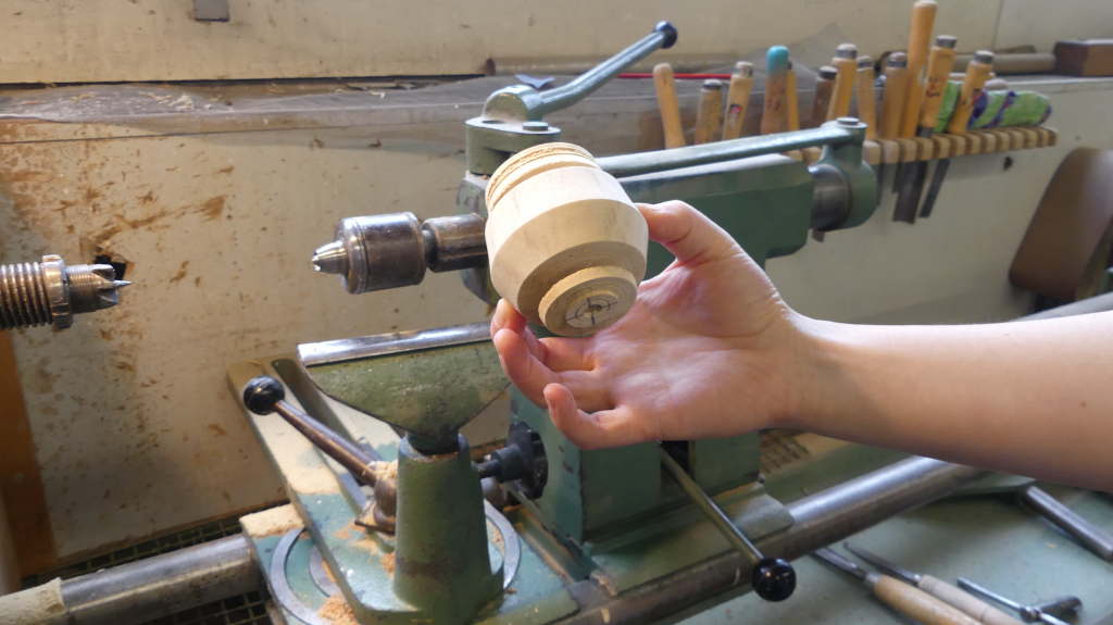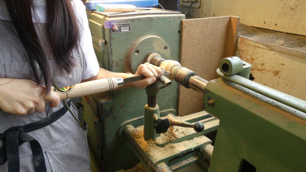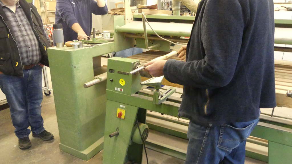 So waren schnell die beiden Drechselbänke mit den ersten Teilen bestückt und es ging ans Werk. Man konnte zusehen, wie die Unsicherheit angesichts des ungewohnten Werkens mit schnell rotierenden Massen bei den Teilnehmern wich und sich erste Ergebnisse abzeichneten.