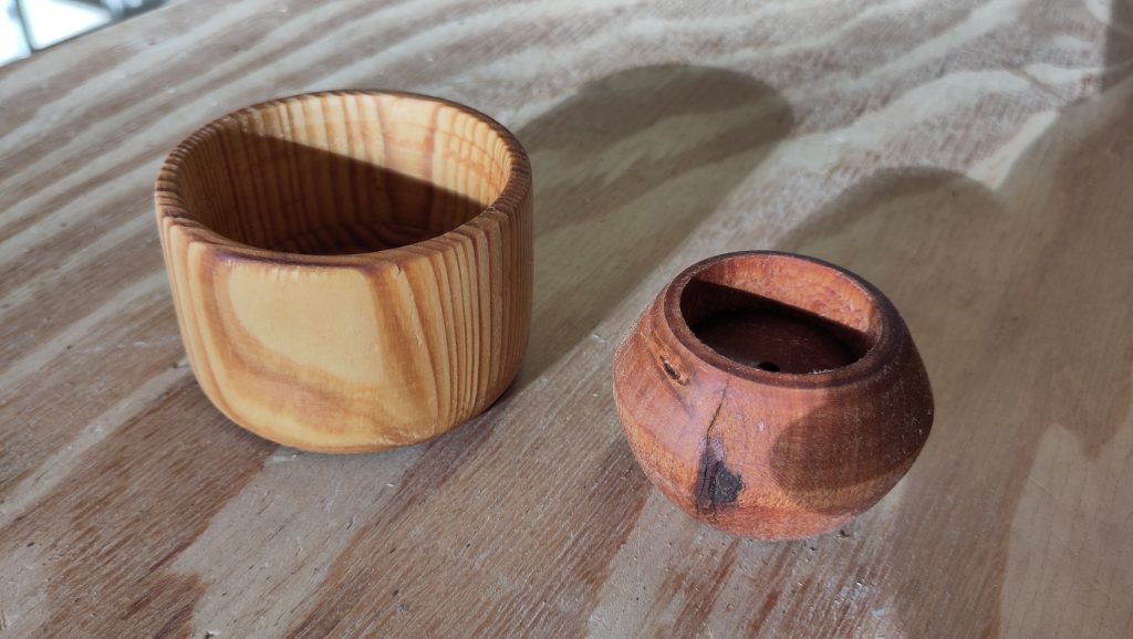 Für unsere ersten Geh- bzw. Drechselversuche stand zunächst hauptsächlich weiches Holz zur Verfügung, um Teelichthalter zu produzieren. Das sollte ein schnelles Ergebnis garantieren, damit die TeilnehmerInnen nicht zu lange warten mussten.