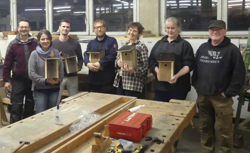 Im ersten Schritt gaben die Kursleiter einen Überblick über das Material und die zum Einsatz kommenden Werkzeuge. Schon recht schnell waren alle dabei, die benötigten Teile zu sägen, zu bohren und zusammen zu fügen. Kleinere Hindernisse, die durch z.B. Risse oder starke Verformung auftraten, wurden durch die Teilnehmer/innen kreativ überwunden, und am Ende hatten alle ihre Nistkästen für Meisen fertig.