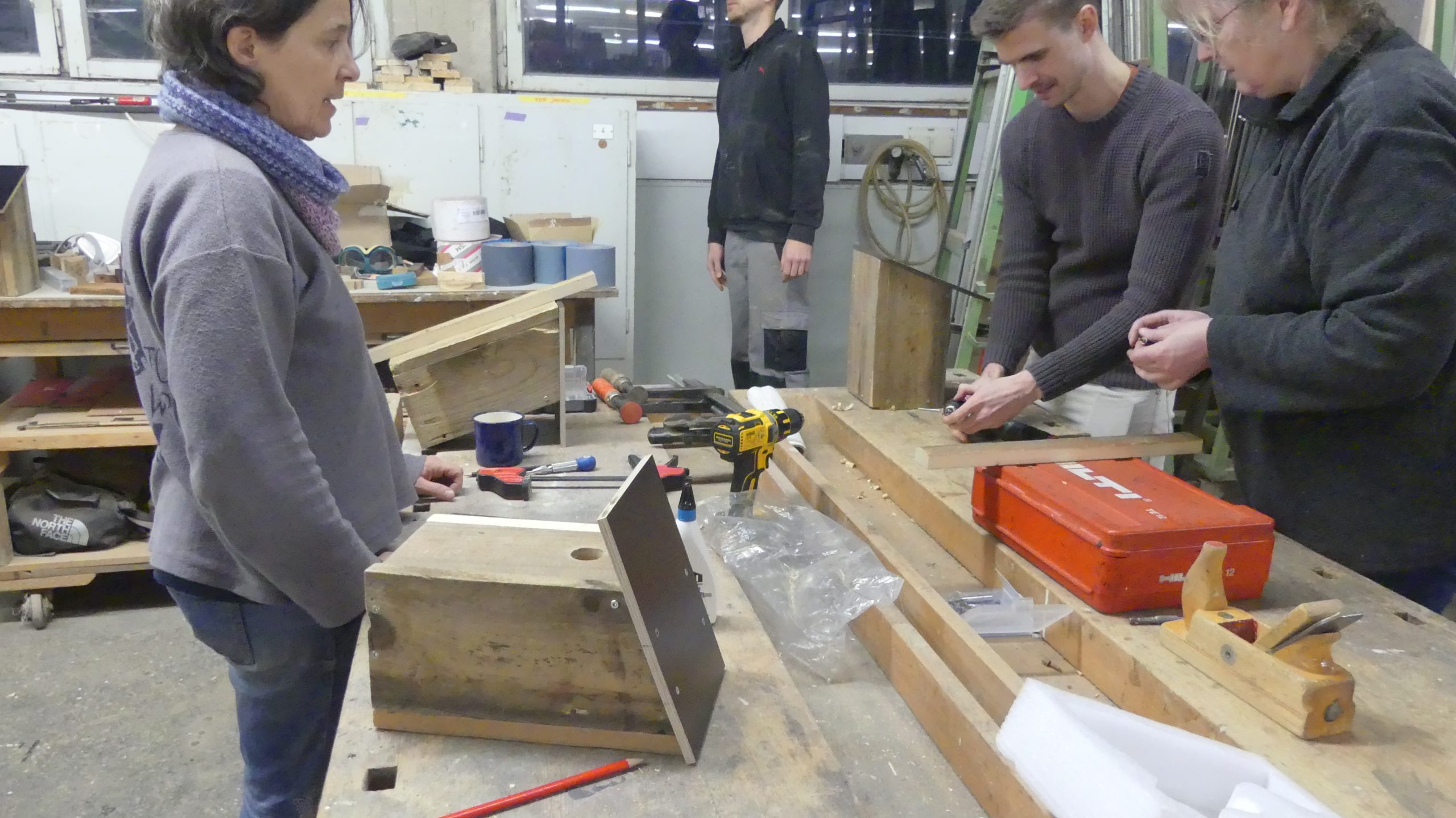 Im ersten Schritt gaben die Kursleiter einen Überblick über das Material und die zum Einsatz kommenden Werkzeuge. Schon recht schnell waren alle dabei, die benötigten Teile zu sägen, zu bohren und zusammen zu fügen. Kleinere Hindernisse, die durch z.B. Risse oder starke Verformung auftraten, wurden durch die Teilnehmer/innen kreativ überwunden, und am Ende hatten alle ihre Nistkästen für Meisen fertig.
