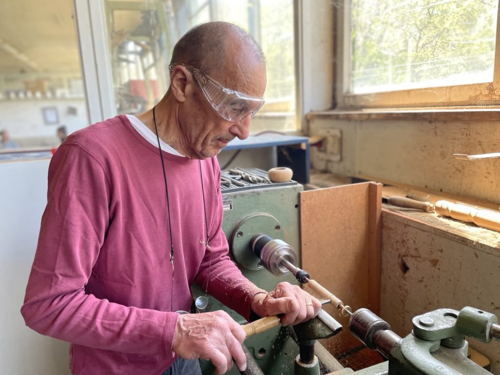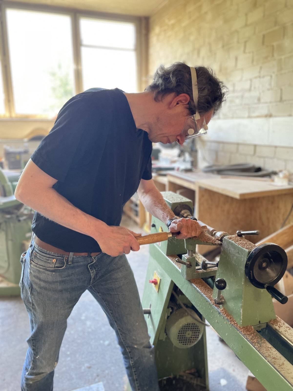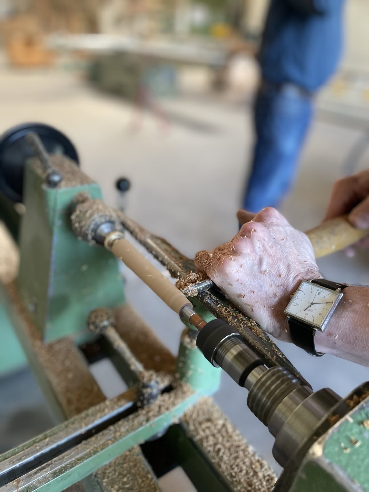 Nach einem Drechsel-Workshop, an dem @TobiasB teilnahm, sieht man ihn regelmäßig in der Werkstatt, wo er Stifte drechselt.