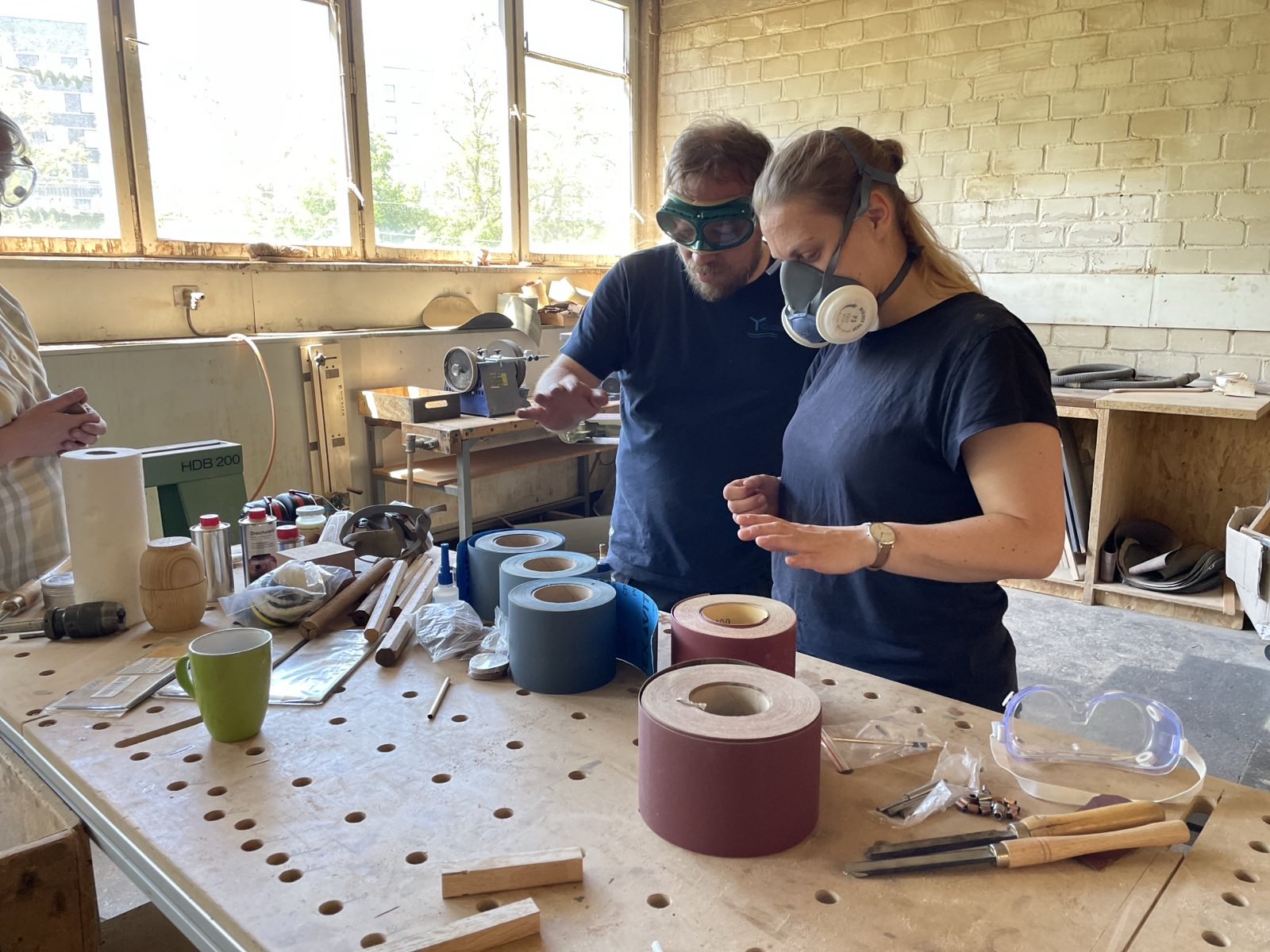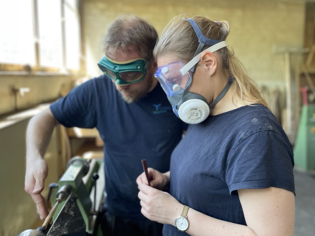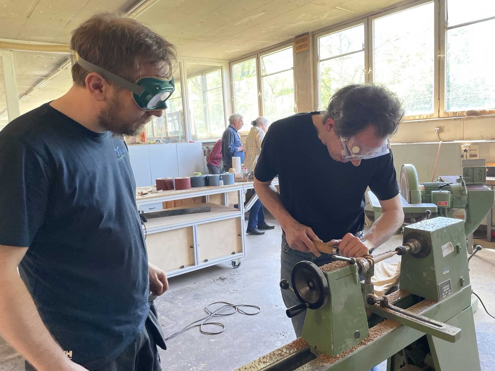 An drei Drechselbänken konnte nun jeder unter fachkundiger Anleitung einen eigenen Stift drechseln. Mit einer Bandbreite an Vorerfahrung zwischen Null und Routine hatten die Teilnehmer/innen ebenso viel Spaß am Drechseln, wie sie nun mit den selbst hergestellten Stiften haben werden.